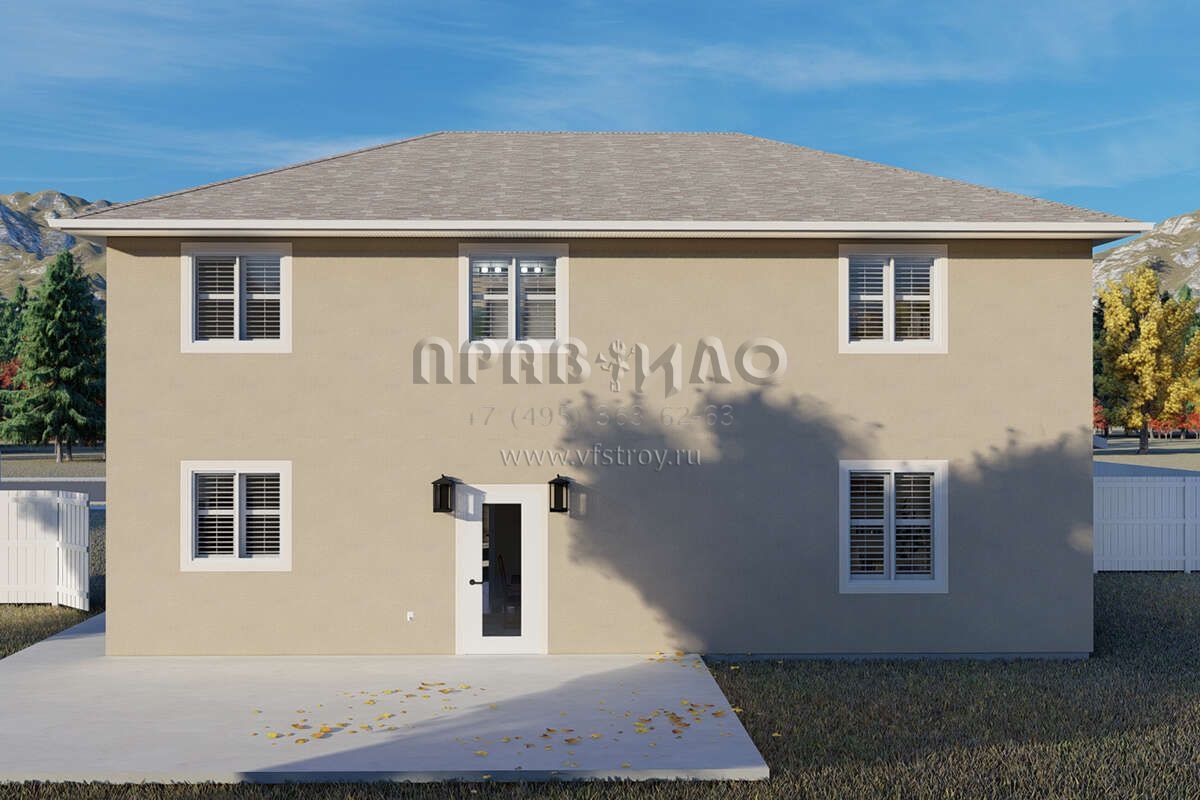 Двухэтажный проект дома позволяет рационально распорядиться площадью участка небольшого размера или узкой формы. На первом этаже находятся общие комнаты (гостиная/столовая, кухня, подсобные и технические помещения), на втором — спальни членов семьи.