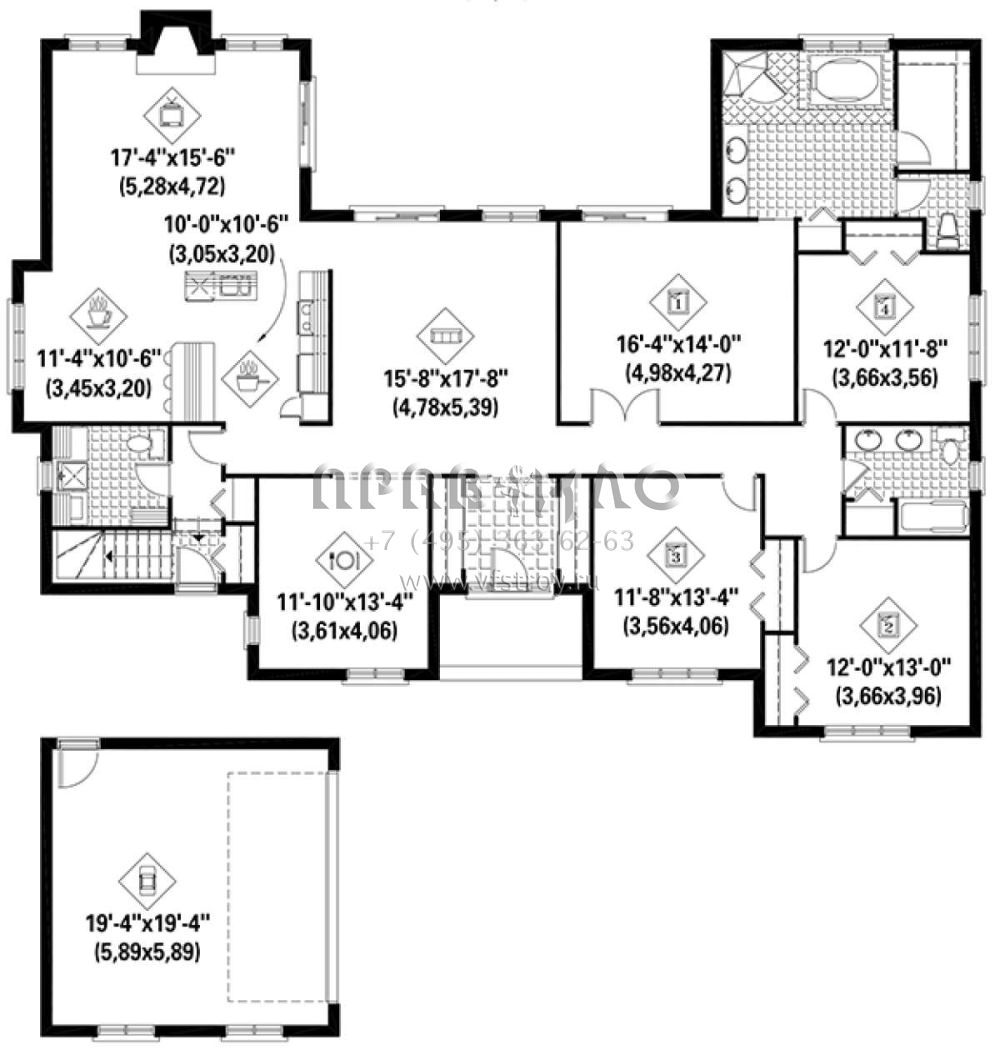 S5-239 (6146-00349) Это иностранный проект, для которого требуется адаптация под нормы, действующие в Российской Федерации. Вы видите проект дома в стиле Ранчо. В этом доме сочетаются черты сельской постройки и аскетичность лофта. Внутри жильцы смогут проводить время с максимальным комфортом. Обратим внимание, что сейчас на планировках все размеры представлены в футах. Для перевода в метры вам необходимо значение в футах умножить на 0,3048.