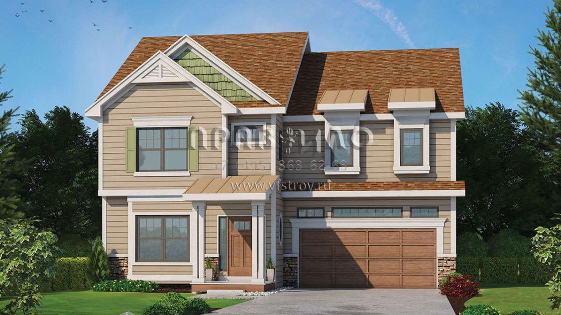 Это проект двухэтажного дома с гаражом на две машины жилой площадью 241 кв.м. Длина дома 15.2 м, ширина 12.2 м, высота 10.1 м. В доме четыре спальни и три санузла.