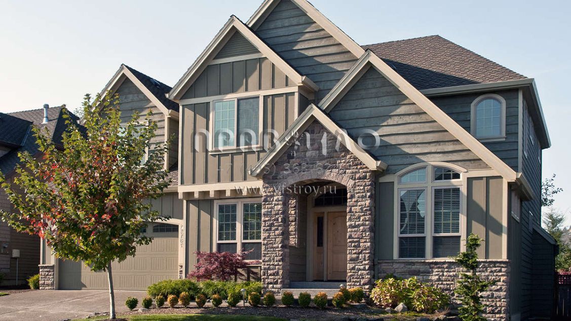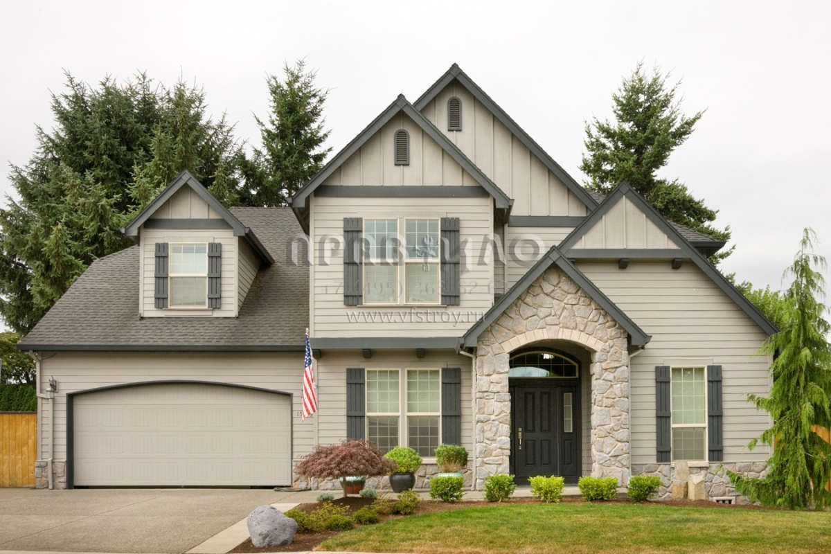 Это проект двухэтажного дома с гаражом на три и более машин жилой площадью 242 кв.м. Длина дома 12.8 м, ширина 15.2 м, высота 9.1 м. В доме четыре спальни и два санузла.