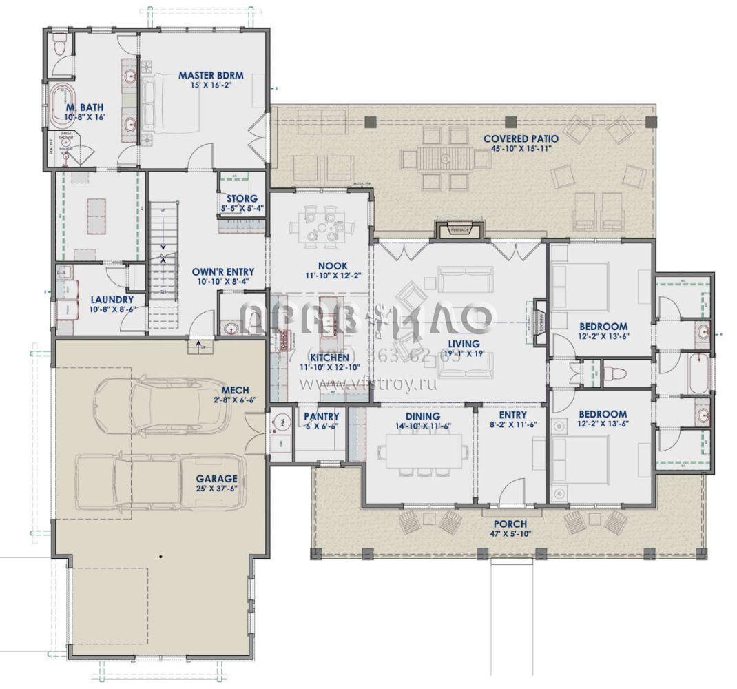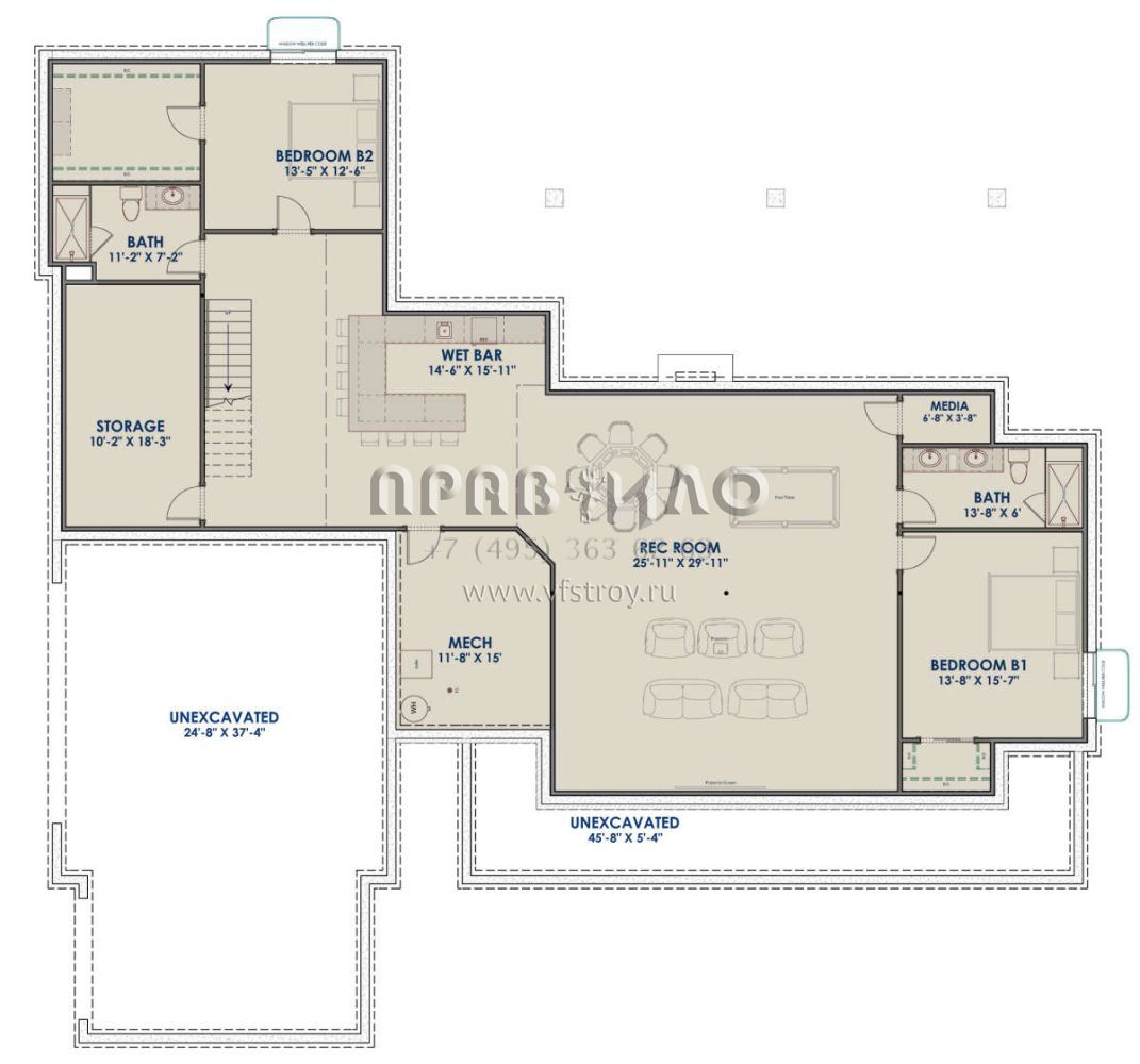 S5-242 (425-00006) Это иностранный проект, для которого требуется адаптация под нормы, действующие в Российской Федерации. Вы видите проект дома в стиле Ранчо. В этом доме сочетаются черты сельской постройки и аскетичность лофта. Внутри жильцы смогут проводить время с максимальным комфортом. Обратим внимание, что сейчас на планировках все размеры представлены в футах. Для перевода в метры вам необходимо значение в футах умножить на 0,3048.