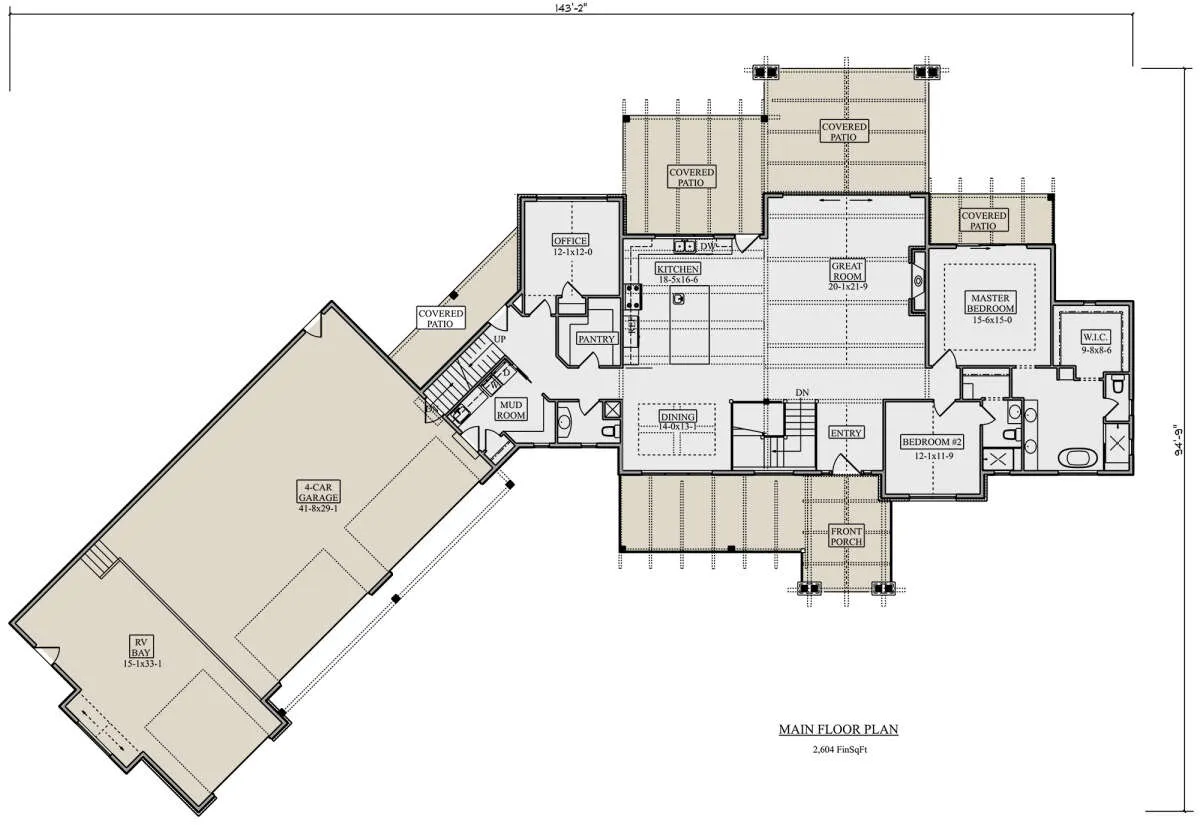 Это проект одноэтажного дома с гаражом на три и более машин жилой площадью 242 кв.м. Длина дома 28.7 м, ширина 43.6 м, высота 7.6 м. В доме две спальни и два санузла.