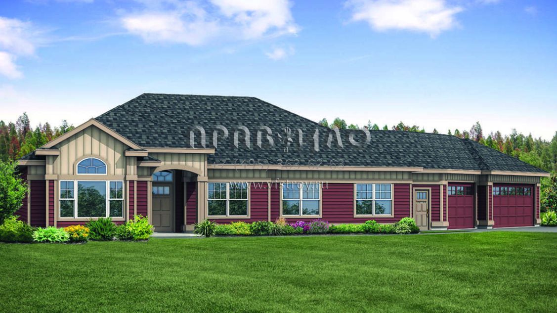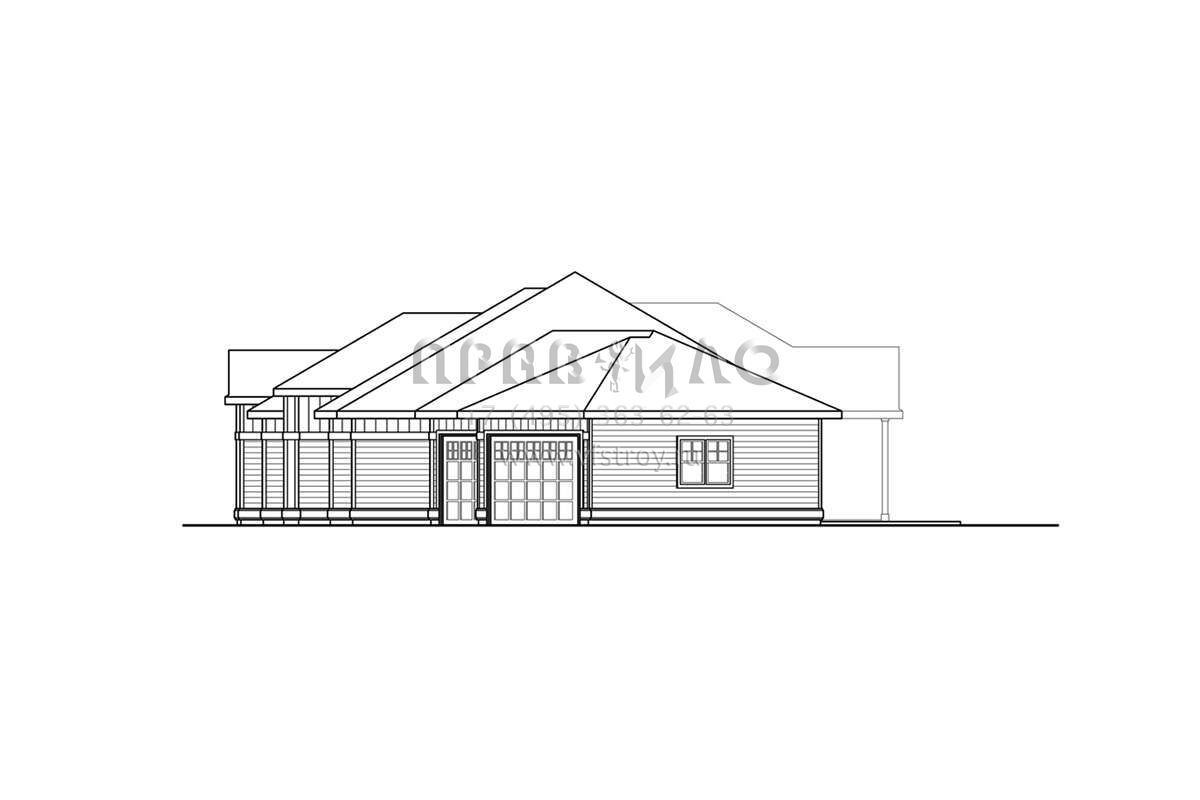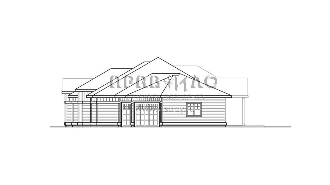 Это проект одноэтажного дома с гаражом на три и более машин жилой площадью 247 кв.м. Длина дома 17.7 м, ширина 29.3 м, высота 6.7 м. В доме три спальни и два санузла.