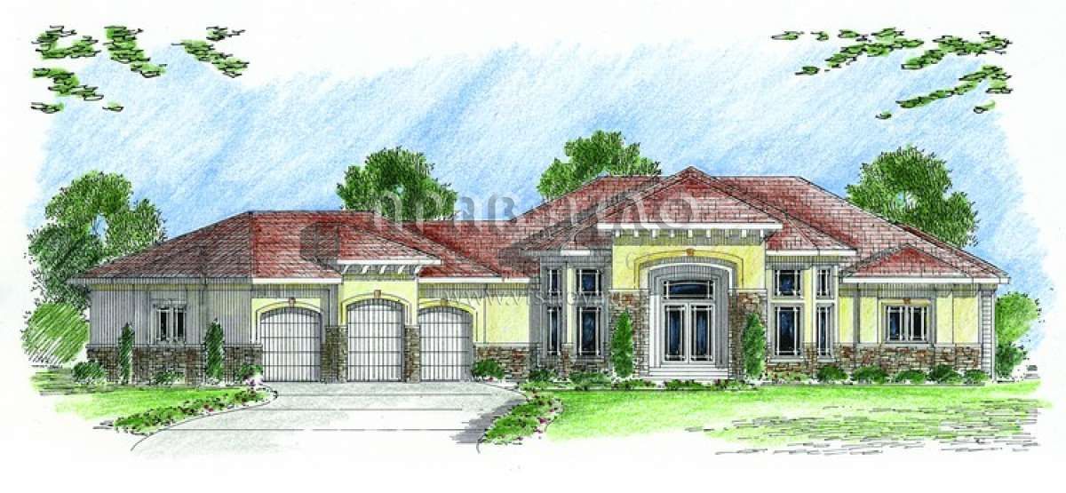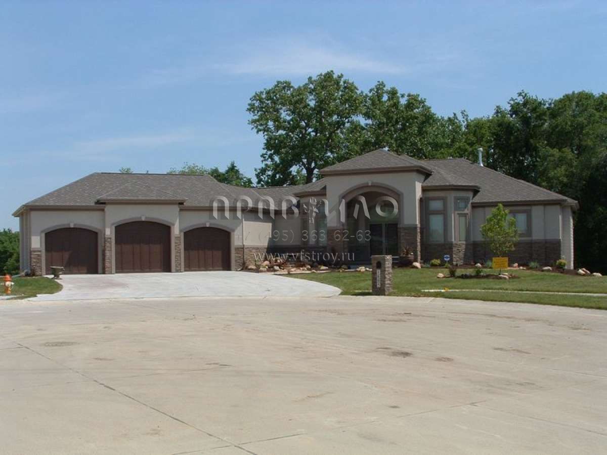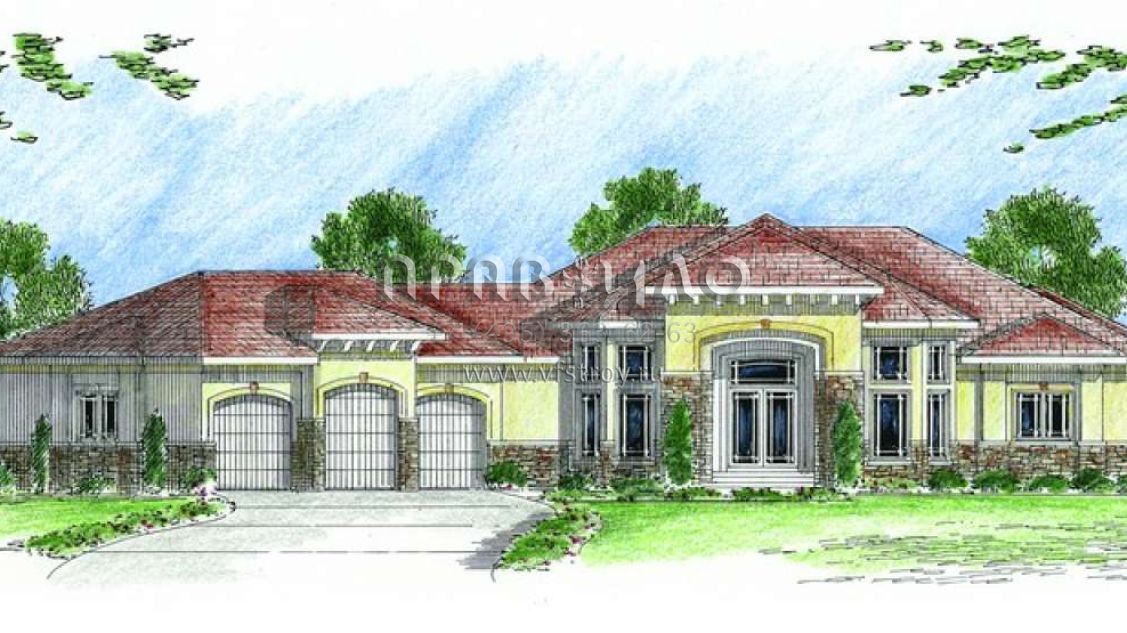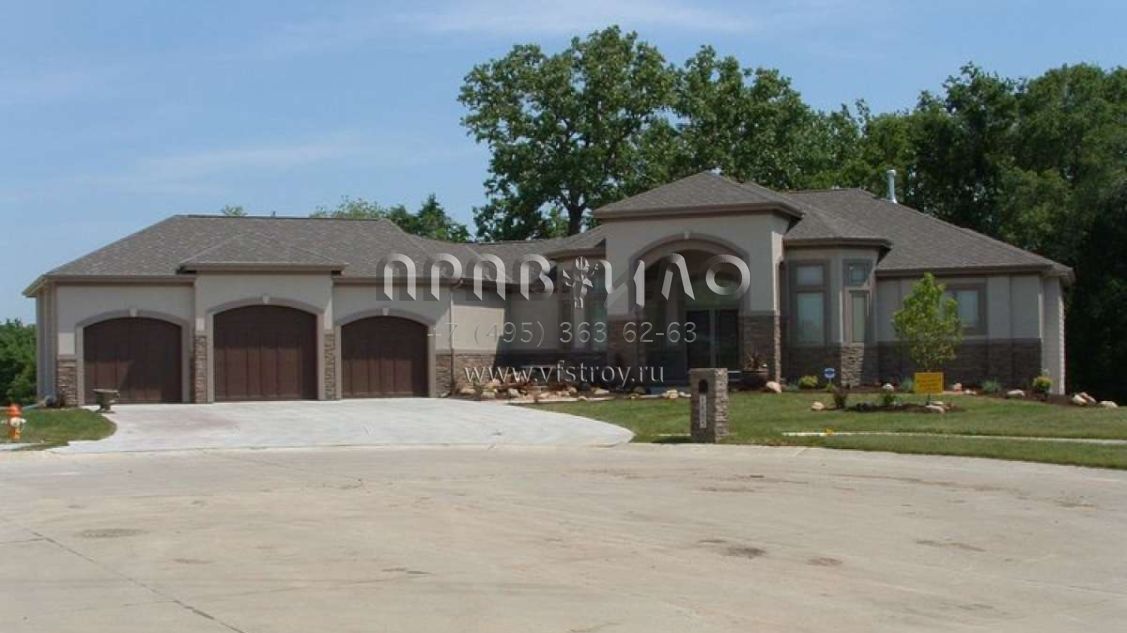 Это проект одноэтажного дома с гаражом на три и более машин жилой площадью 250 кв.м. Длина дома 26.2 м, ширина 30.5 м, высота 6.7 м. В доме две спальни и два санузла.