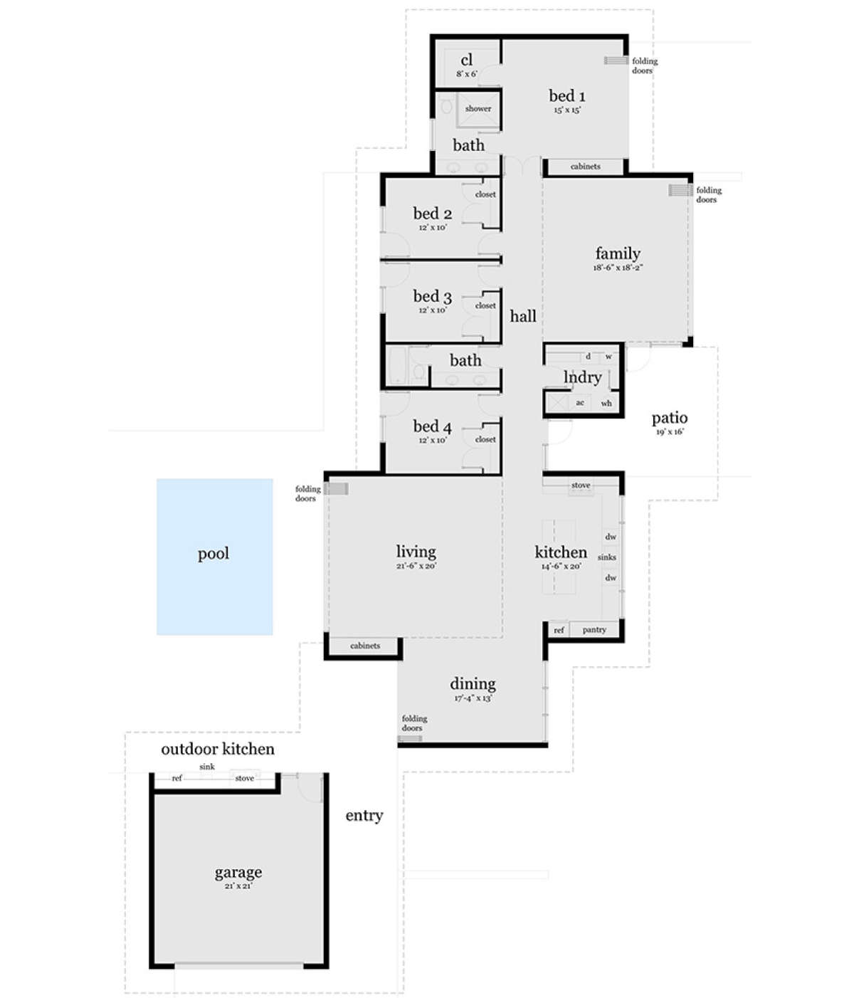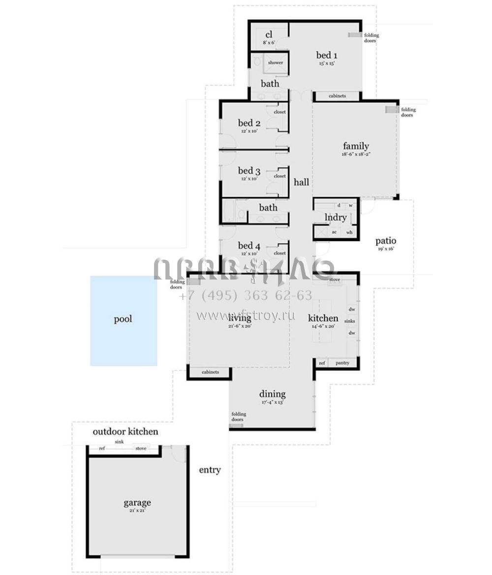 Это проект одноэтажного дома с гаражом на две машины жилой площадью 251 кв.м. Длина дома 35.4 м, ширина 22.6 м, высота 6.4 м. В доме четыре спальни и два санузла.