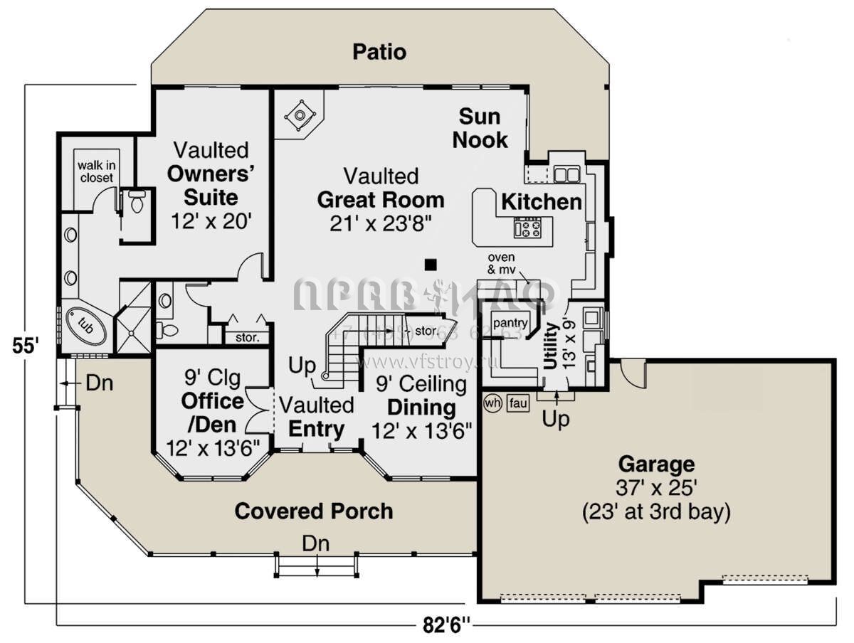 S5-251 (035-01038) Это иностранный проект, для которого требуется адаптация под нормы, действующие в Российской Федерации. Вы видите проект дома в стиле Ранчо. В этом доме сочетаются черты сельской постройки и аскетичность лофта. Внутри жильцы смогут проводить время с максимальным комфортом. Обратим внимание, что сейчас на планировках все размеры представлены в футах. Для перевода в метры вам необходимо значение в футах умножить на 0,3048.