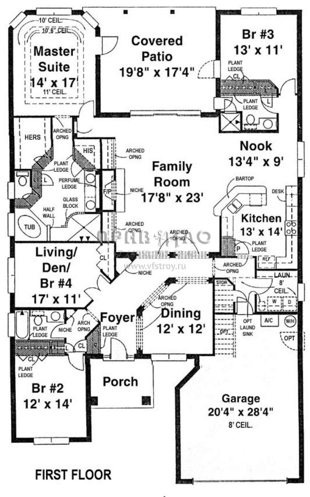 S5-251 (4766-00074) Это иностранный проект, для которого требуется адаптация под нормы, действующие в Российской Федерации. Вы видите проект дома в стиле Ранчо. В этом доме сочетаются черты сельской постройки и аскетичность лофта. Внутри жильцы смогут проводить время с максимальным комфортом. Обратим внимание, что сейчас на планировках все размеры представлены в футах. Для перевода в метры вам необходимо значение в футах умножить на 0,3048.