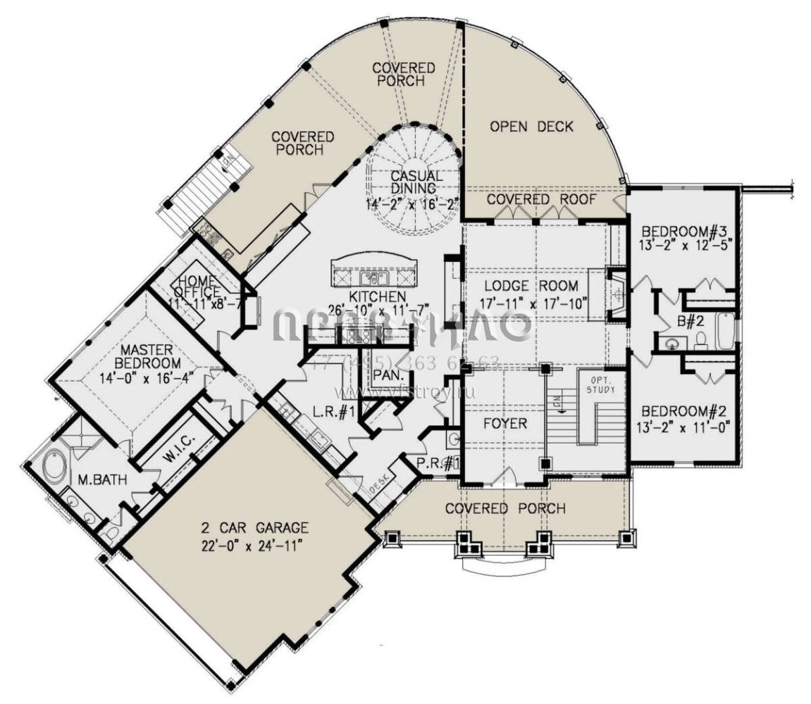 S5-252 (699-00273) Это иностранный проект, для которого требуется адаптация под нормы, действующие в Российской Федерации. Вы видите проект дома в стиле Ранчо. В этом доме сочетаются черты сельской постройки и аскетичность лофта. Внутри жильцы смогут проводить время с максимальным комфортом. Обратим внимание, что сейчас на планировках все размеры представлены в футах. Для перевода в метры вам необходимо значение в футах умножить на 0,3048.