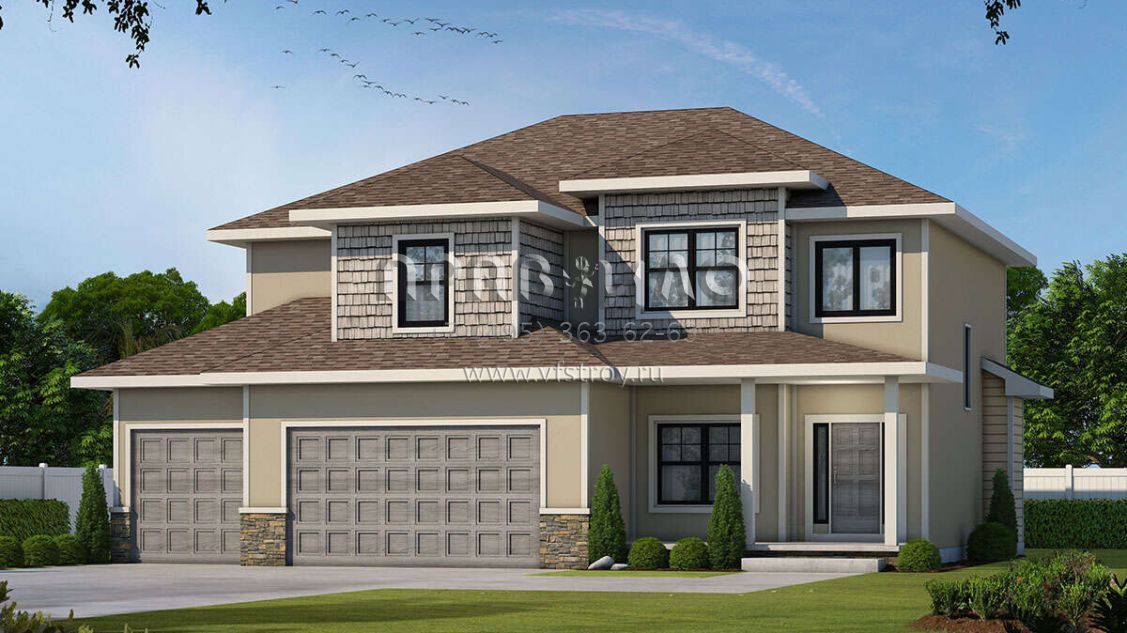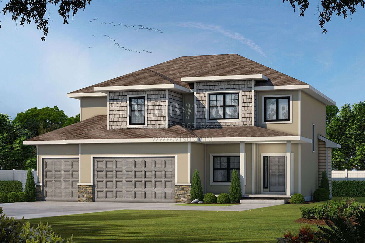 Проект двухэтажного дома с гаражом на три и более машин в стиле Райт S5-254 (402-01628)