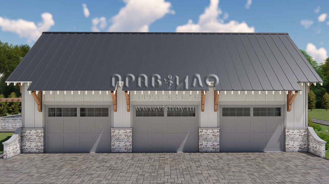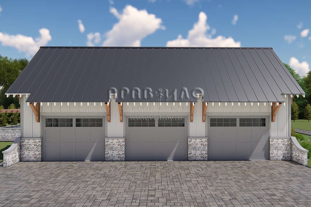 Это проект двухэтажного дома с гаражом на три и более машин жилой площадью 256 кв.м. Длина дома 21.3 м, ширина 28.7 м, высота 9.8 м. В доме четыре спальни и три санузла.