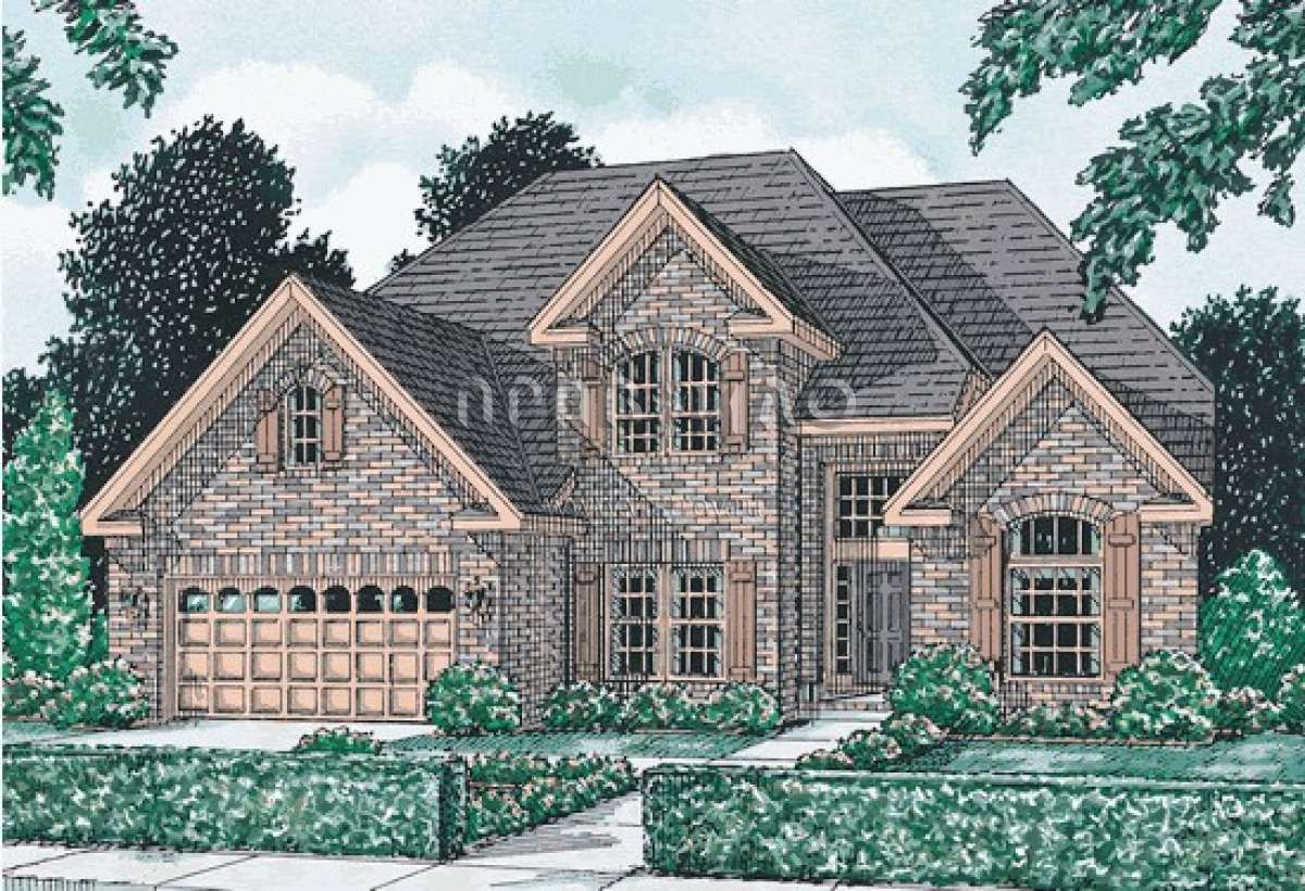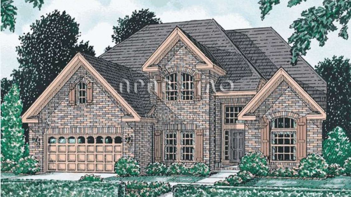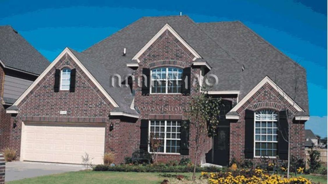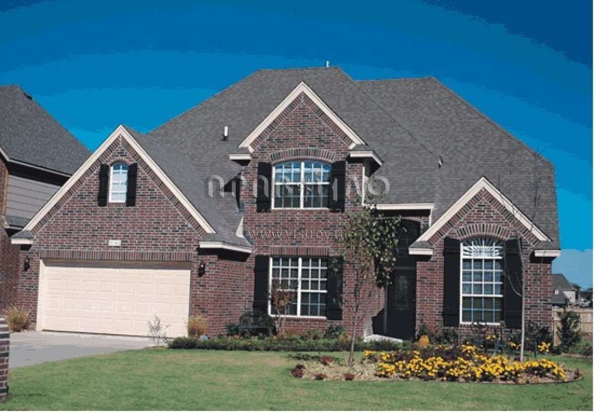 Это проект двухэтажного дома с гаражом на три и более машин жилой площадью 256 кв.м. Длина дома 19.2 м, ширина 15.2 м, высота 10.1 м. В доме четыре спальни и два санузла.