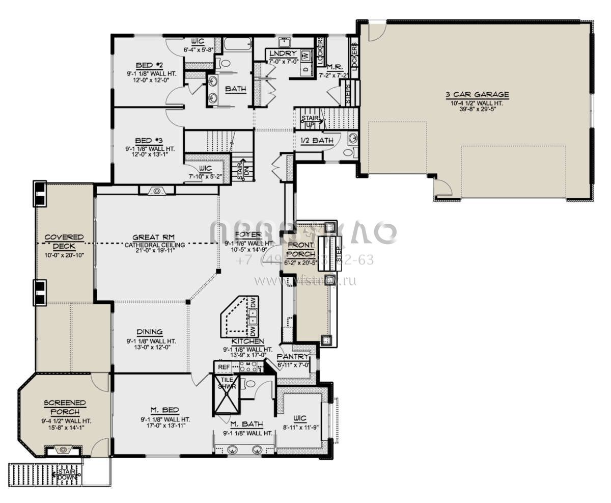 Это проект одноэтажного дома с гаражом на три и более машин жилой площадью 258 кв.м. Длина дома 22.9 м, ширина 30.2 м, высота 6.1 м. В доме три спальни и два санузла.