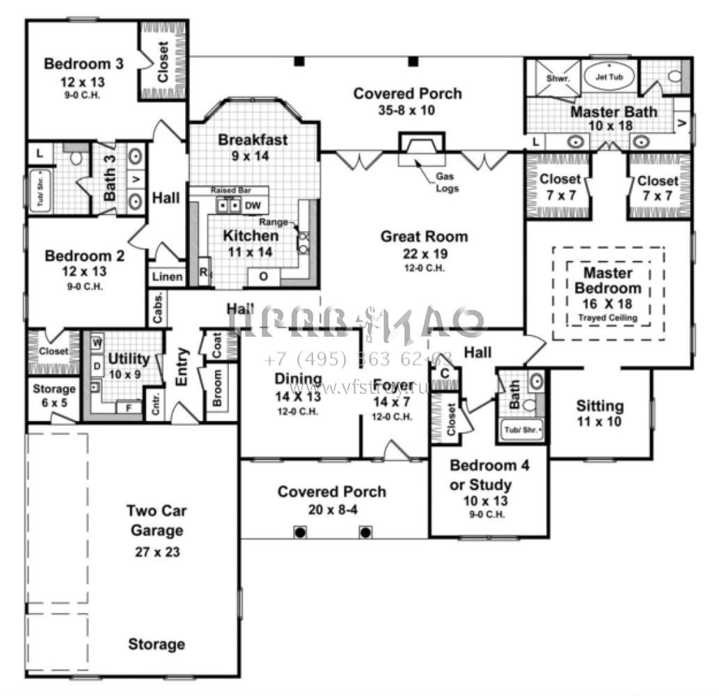 S5-261 (348-00192) Это иностранный проект, для которого требуется адаптация под нормы, действующие в Российской Федерации. Вы видите проект дома в стиле Ранчо. В этом доме сочетаются черты сельской постройки и аскетичность лофта. Внутри жильцы смогут проводить время с максимальным комфортом. Обратим внимание, что сейчас на планировках все размеры представлены в футах. Для перевода в метры вам необходимо значение в футах умножить на 0,3048.