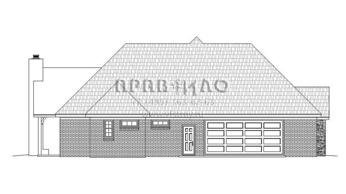 Это проект одноэтажного дома с гаражом на две машины жилой площадью 262 кв.м. Длина дома 21.3 м, ширина 28.3 м, высота 8.2 м. В доме три спальни и два санузла.