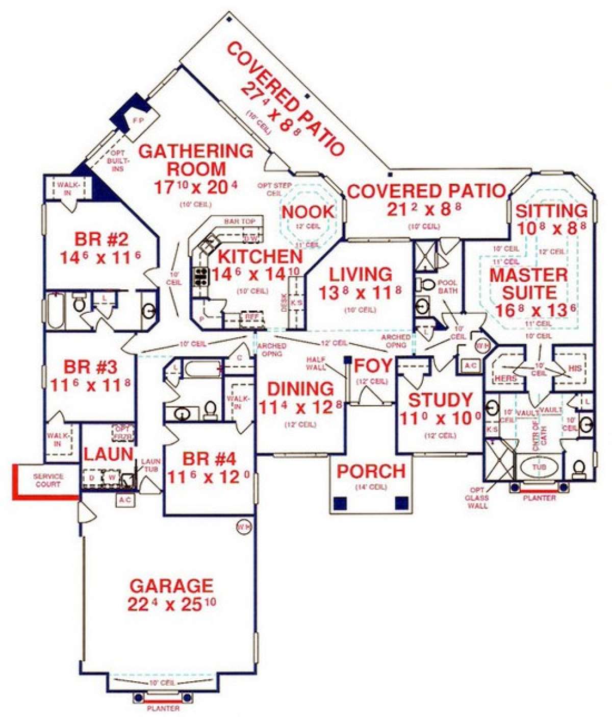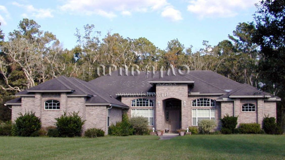 Это проект одноэтажного дома с гаражом на две машины жилой площадью 263 кв.м. Длина дома 27.4 м, ширина 21.6 м, высота 6.7 м. В доме пять спален и четыре санузла.