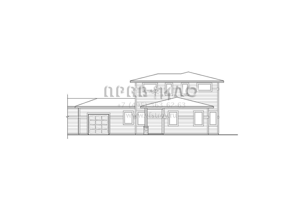 Это проект двухэтажного дома с гаражом на две машины жилой площадью 265 кв.м. Длина дома 33.8 м, ширина 22.3 м, высота 7.3 м. В доме три спальни и два санузла.