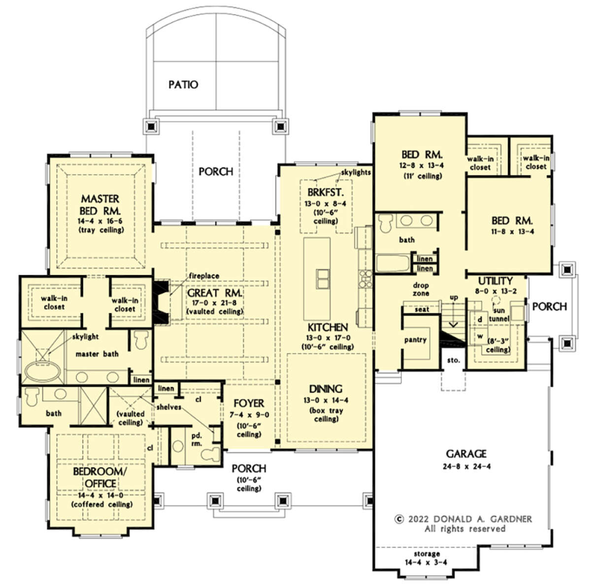 Это проект одноэтажного дома с гаражом на две машины жилой площадью 265 кв.м. Длина дома 19.8 м, ширина 23.5 м, высота 9.1 м. В доме четыре спальни и три санузла.
