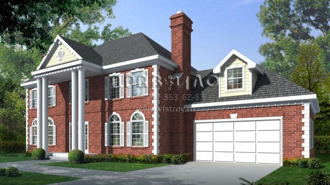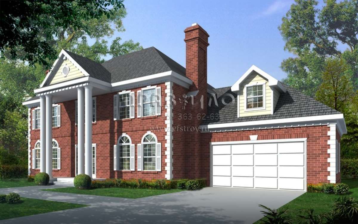 Это проект двухэтажного дома с гаражом на две машины жилой площадью 265 кв.м. Длина дома 11.6 м, ширина 20.4 м, высота 10.1 м. В доме три спальни и два санузла.