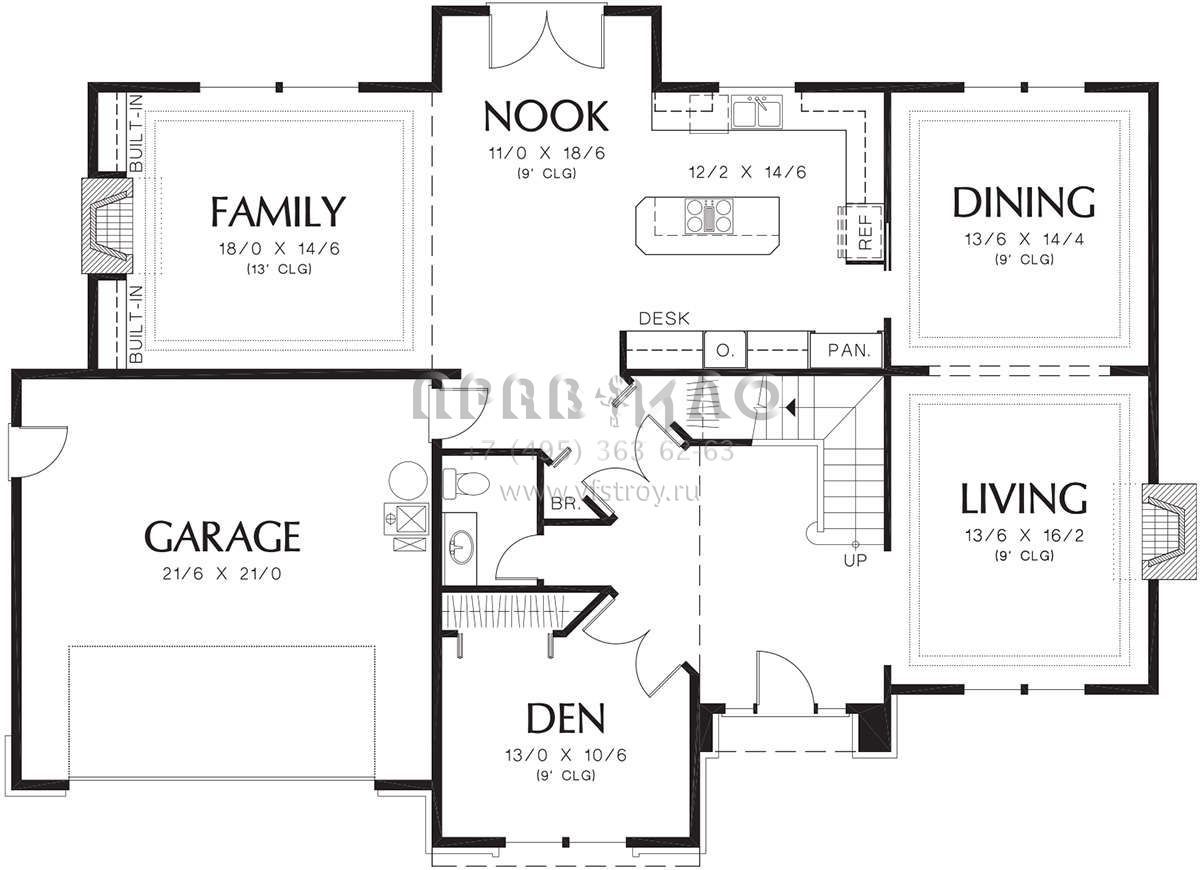 S5-266 (2559-00477) Это иностранный проект, для которого требуется адаптация под нормы, действующие в Российской Федерации. Вы видите проект дома в стиле Ранчо. В этом доме сочетаются черты сельской постройки и аскетичность лофта. Внутри жильцы смогут проводить время с максимальным комфортом. Обратим внимание, что сейчас на планировках все размеры представлены в футах. Для перевода в метры вам необходимо значение в футах умножить на 0,3048.