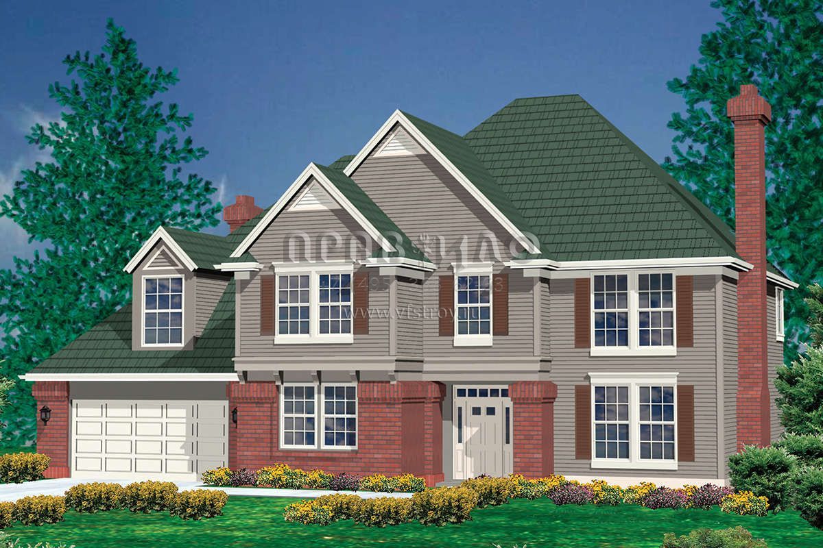Это проект двухэтажного дома с гаражом на две машины жилой площадью 266 кв.м. Длина дома 13.7 м, ширина 18.3 м, высота 10.7 м. В доме три спальни и два санузла.