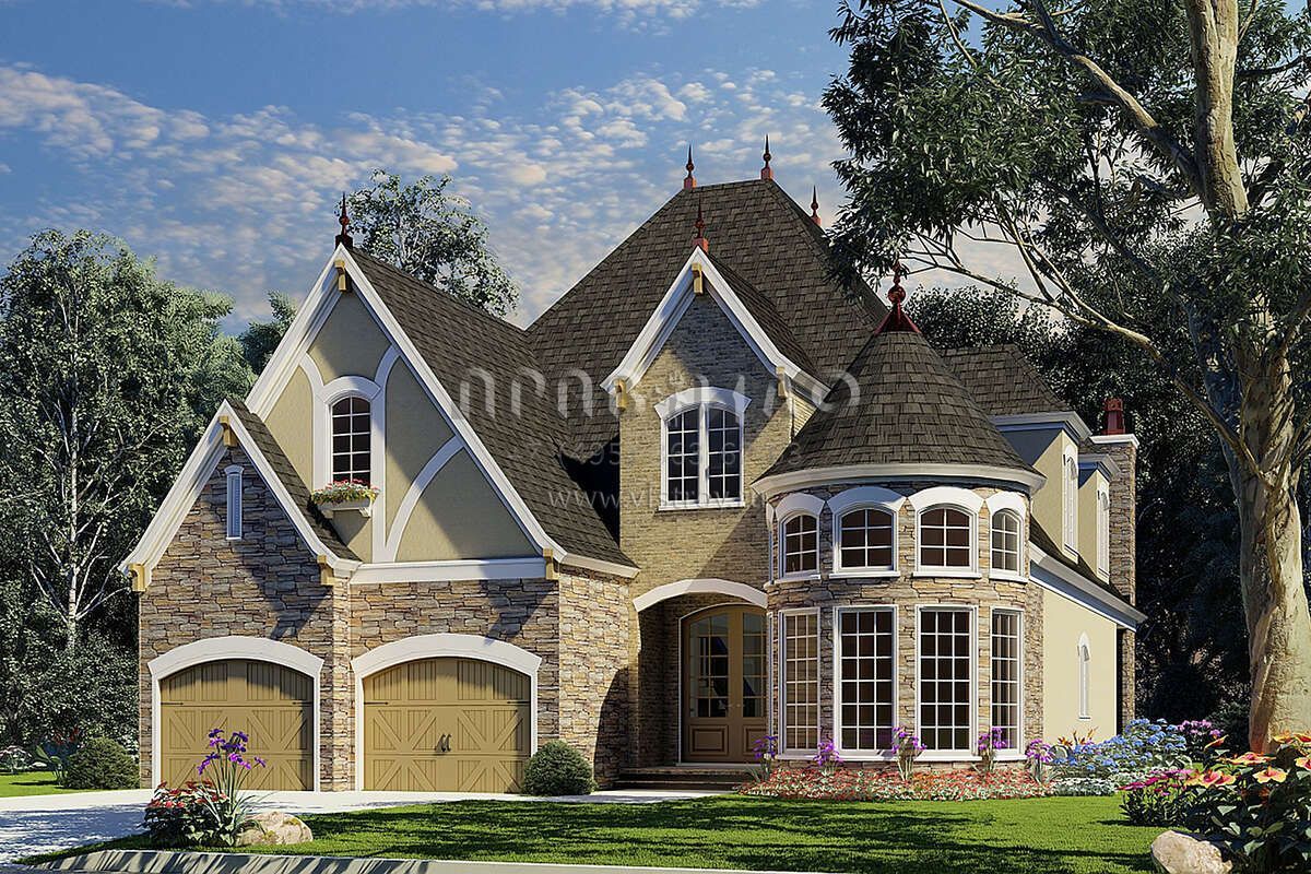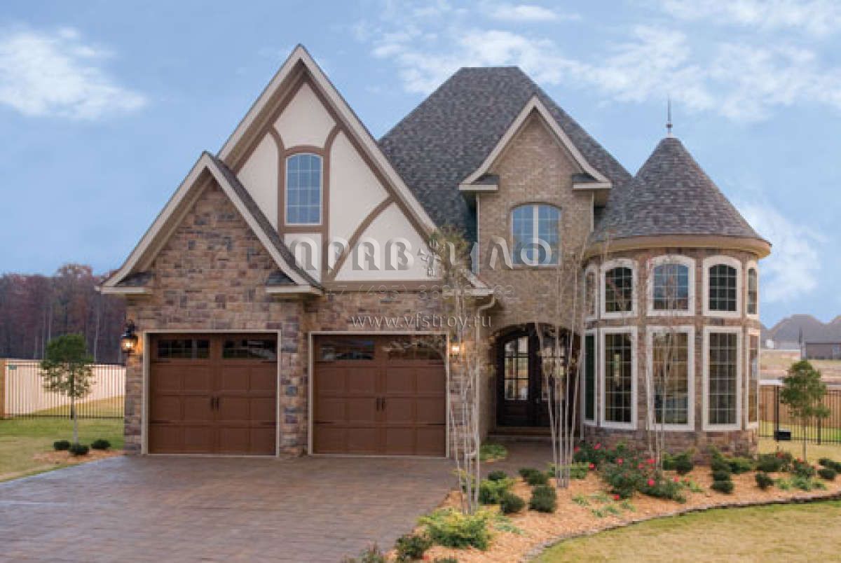 Это проект двухэтажного дома с гаражом на две машины жилой площадью 268 кв.м. Длина дома 24.1 м, ширина 12.8 м, высота 10.4 м. В доме четыре спальни и два санузла.