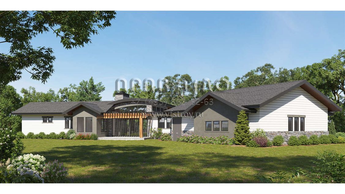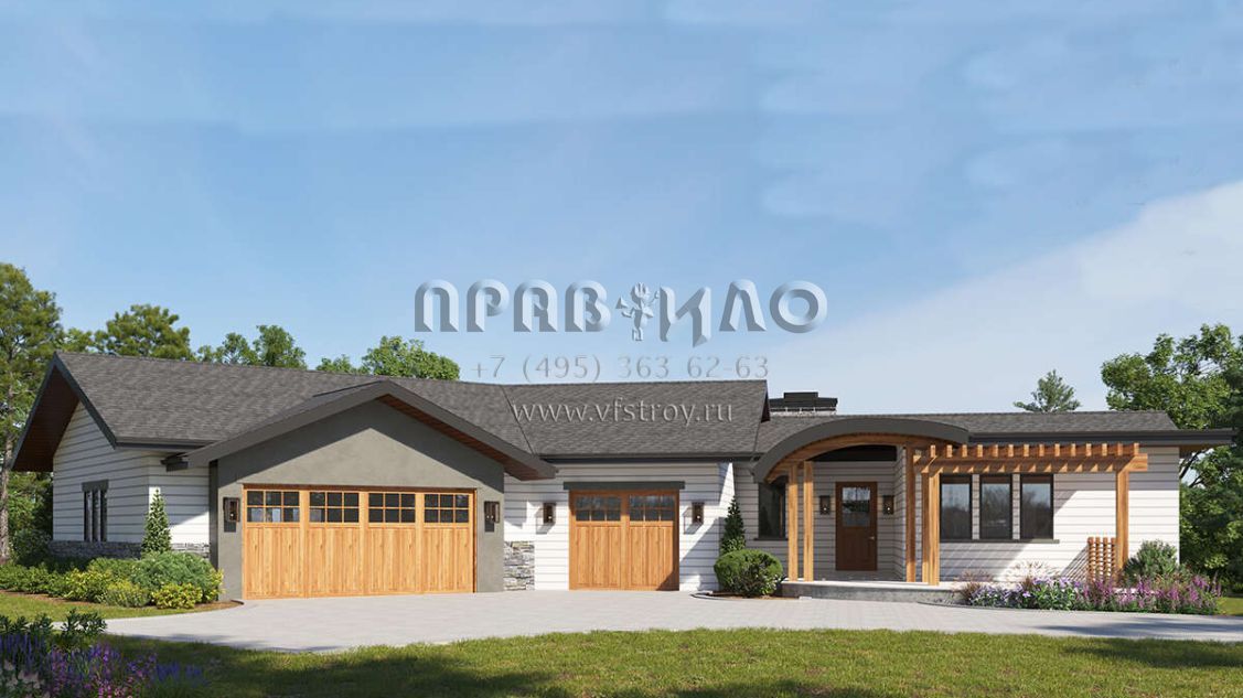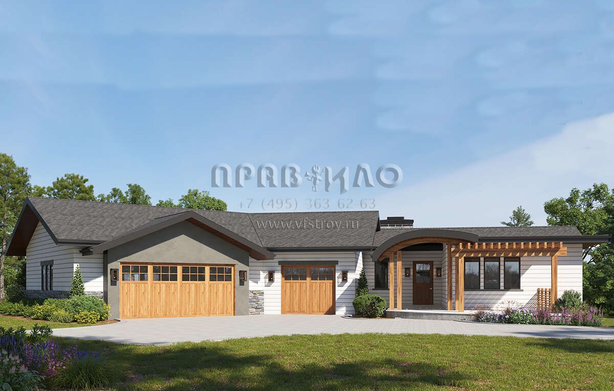 Это проект одноэтажного дома с гаражом на три и более машин жилой площадью 268 кв.м. Длина дома 28.3 м, ширина 36.3 м, высота 5.2 м. В доме три спальни и два санузла.