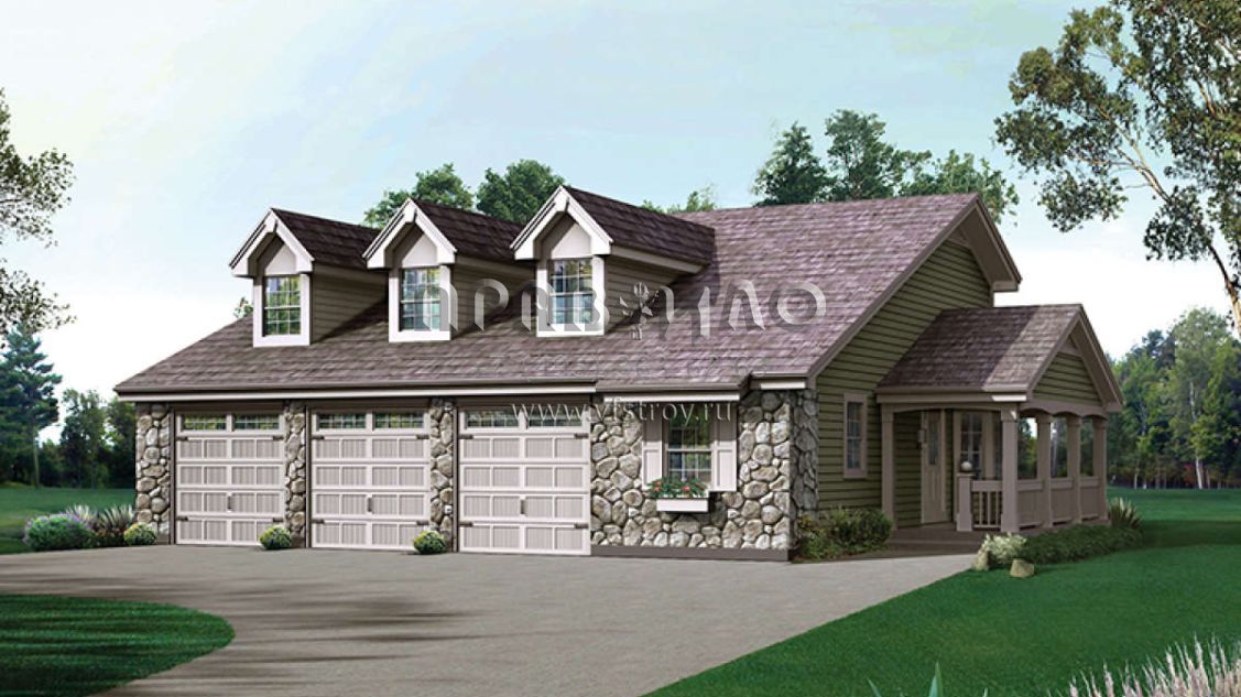 Это проект двухэтажного дома с гаражом на три и более машин жилой площадью 268 кв.м. Длина дома 12.8 м, ширина 15.8 м, высота 7 м. В доме три спальни и три санузла.