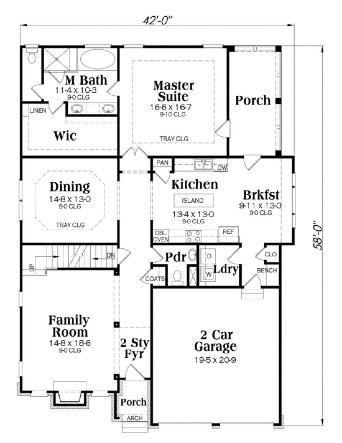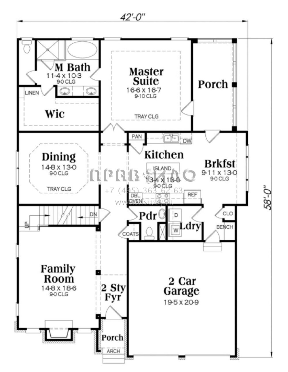 S5-274 (009-00131) Это иностранный проект, для которого требуется адаптация под нормы, действующие в Российской Федерации. Вы видите проект дома в стиле Ранчо. В этом доме сочетаются черты сельской постройки и аскетичность лофта. Внутри жильцы смогут проводить время с максимальным комфортом. Обратим внимание, что сейчас на планировках все размеры представлены в футах. Для перевода в метры вам необходимо значение в футах умножить на 0,3048.