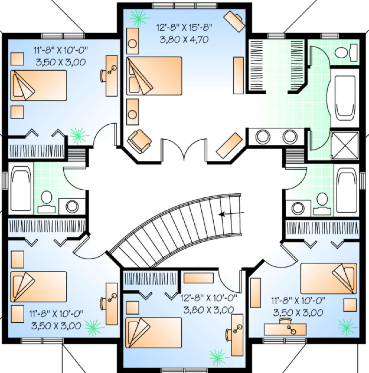 Двухэтажный проект дома позволяет рационально распорядиться площадью участка небольшого размера или узкой формы. На первом этаже находятся общие комнаты (гостиная/столовая, кухня, подсобные и технические помещения), на втором — спальни членов семьи.