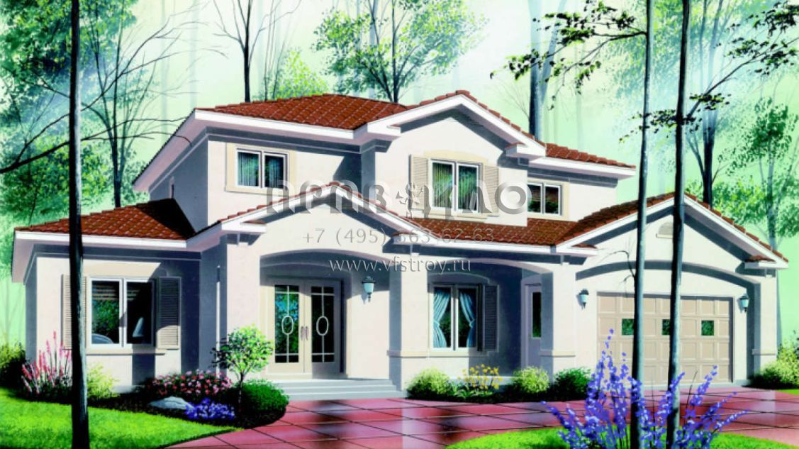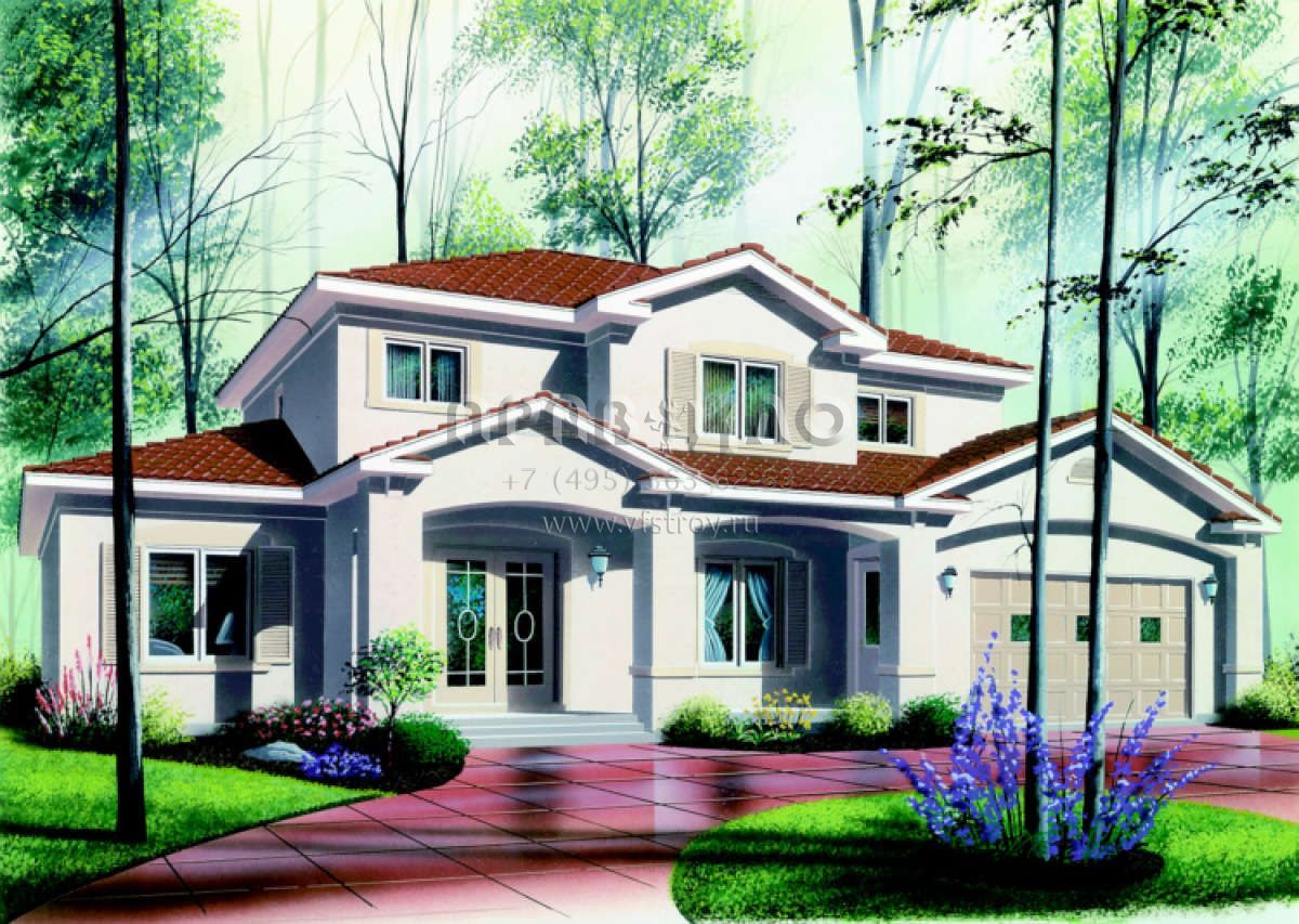Это проект двухэтажного дома с гаражом на две машины жилой площадью 280 кв.м. Длина дома 14.3 м, ширина 18.3 м, высота 8.2 м. В доме шесть и более спален и четыре санузла.