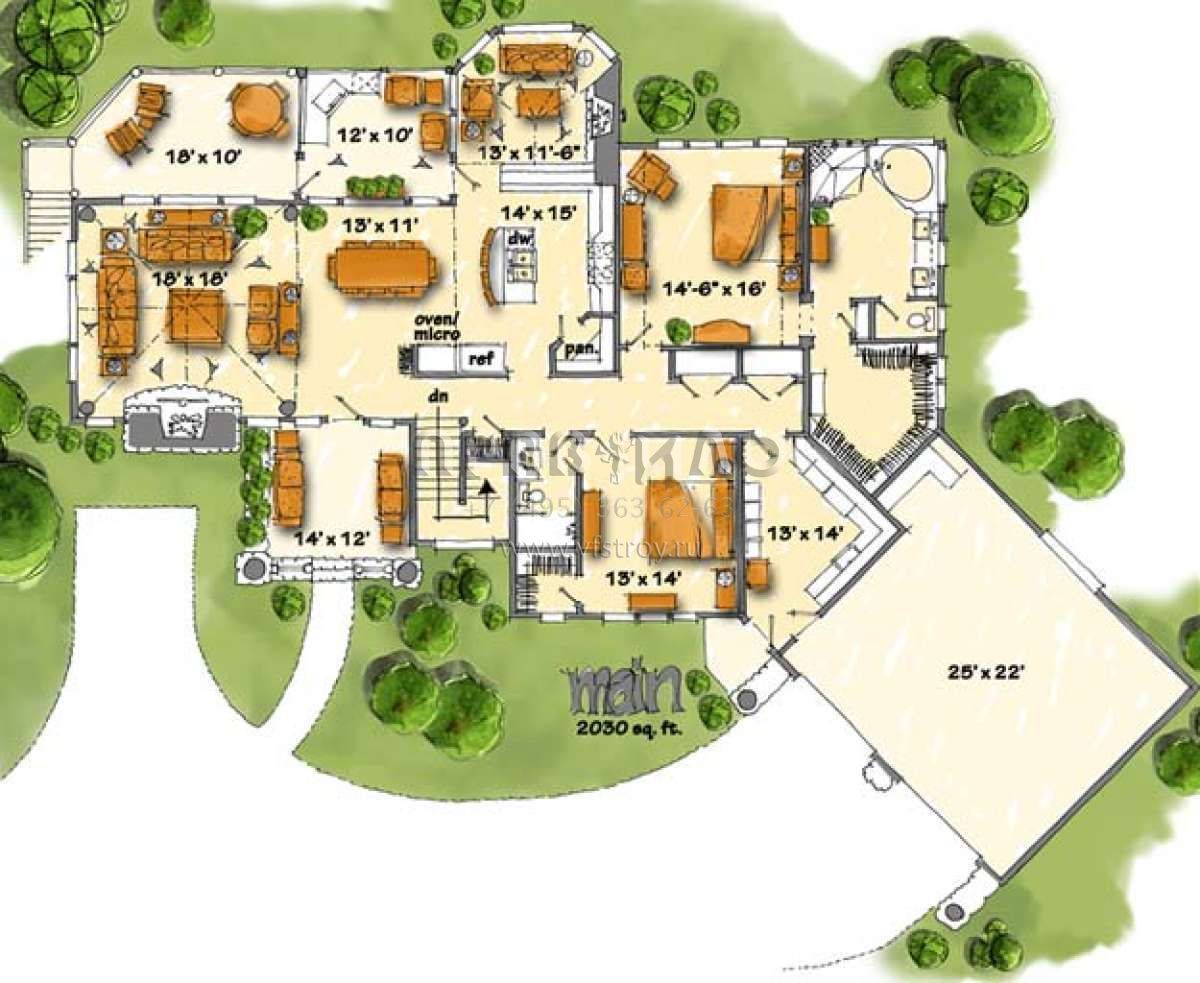 Большая площадь участка позволяет выбрать одноэтажный проект дома, особенно если в семье есть пожилые люди, инвалиды или маленькие дети.