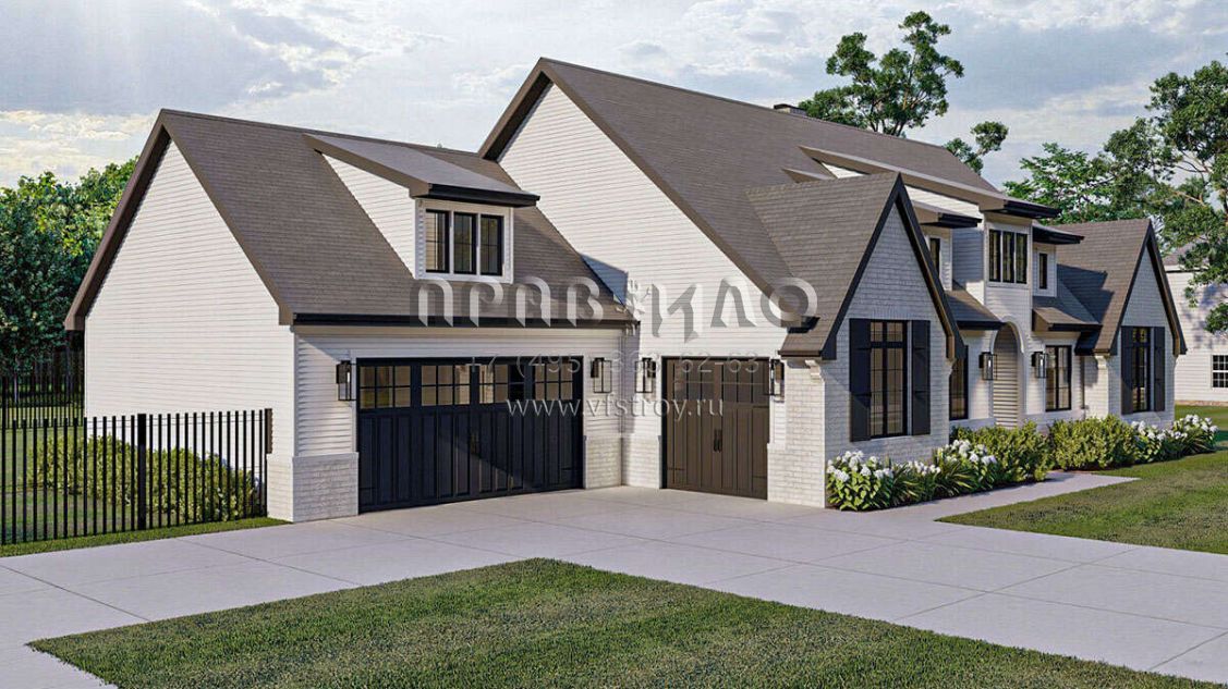 Это проект двухэтажного дома с гаражом на три и более машин жилой площадью 284 кв.м. Длина дома 16.8 м, ширина 25.9 м, высота 9.1 м. В доме три спальни и два санузла.