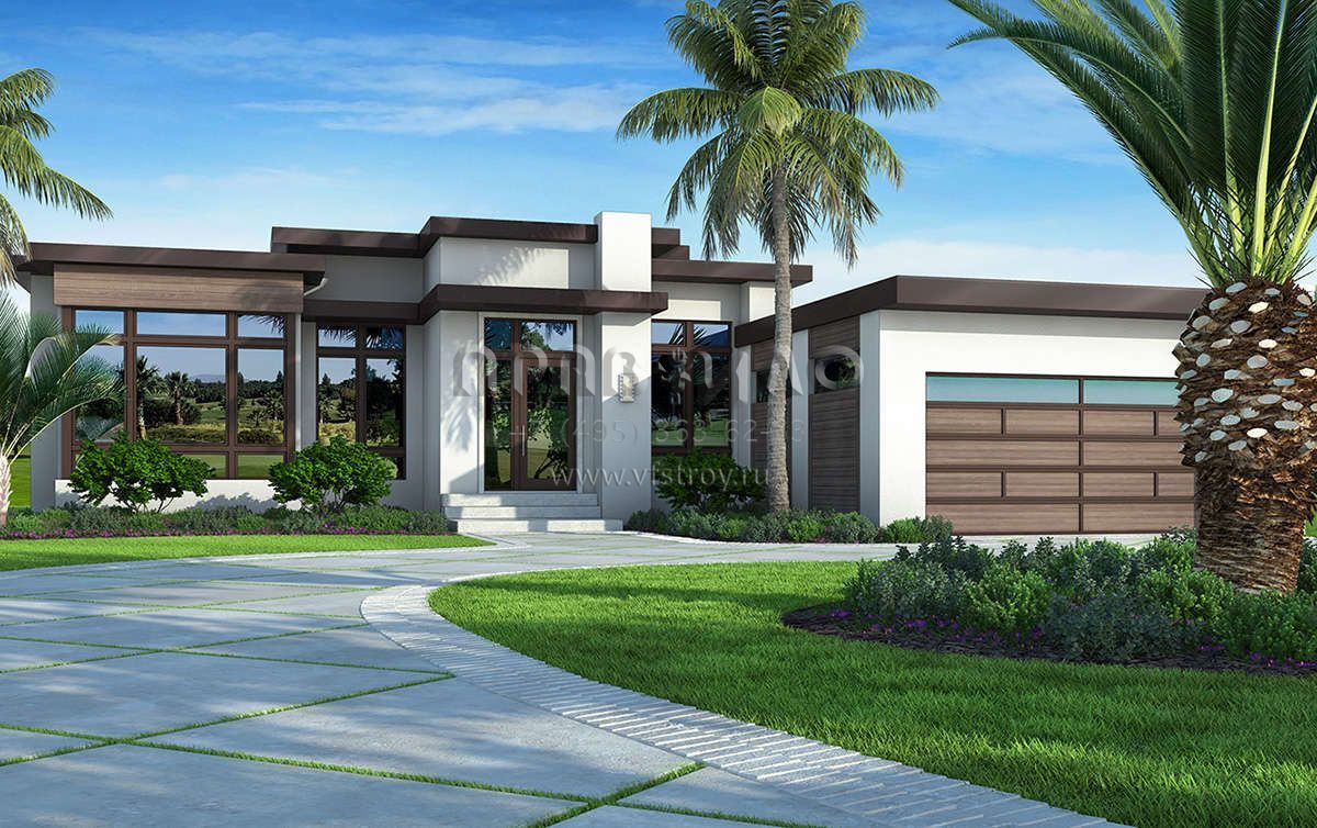 Это проект одноэтажного дома с гаражом на две машины жилой площадью 286 кв.м. Длина дома 30.5 м, ширина 19.8 м, высота 5.2 м. В доме три спальни и три санузла.