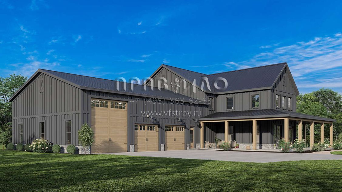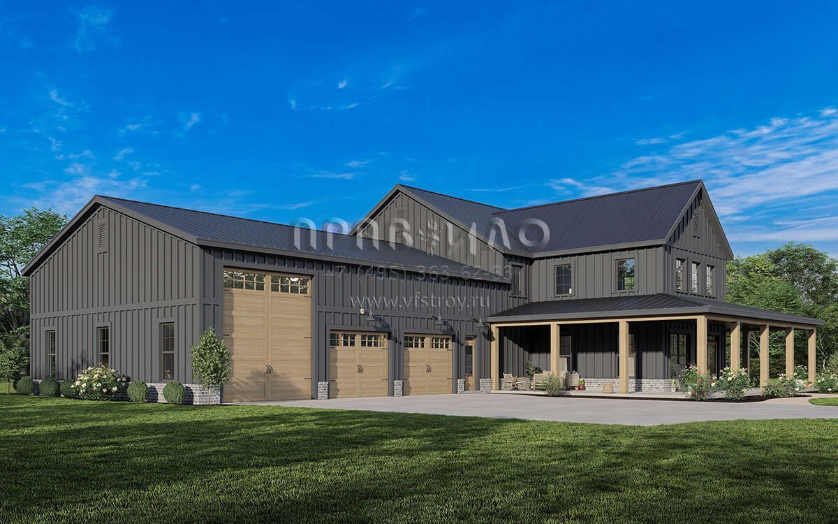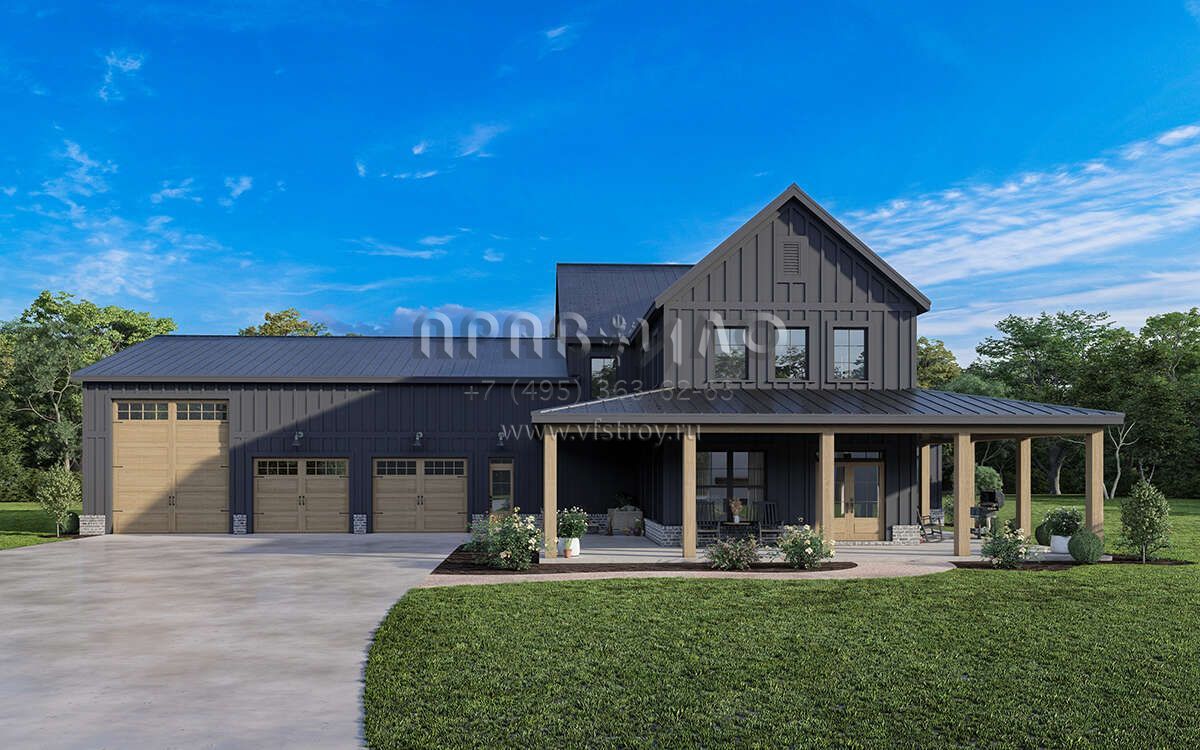 Это проект двухэтажного дома с гаражом на три и более машин жилой площадью 287 кв.м. Длина дома 21.6 м, ширина 28.7 м, высота 9.8 м. В доме четыре спальни и три санузла.