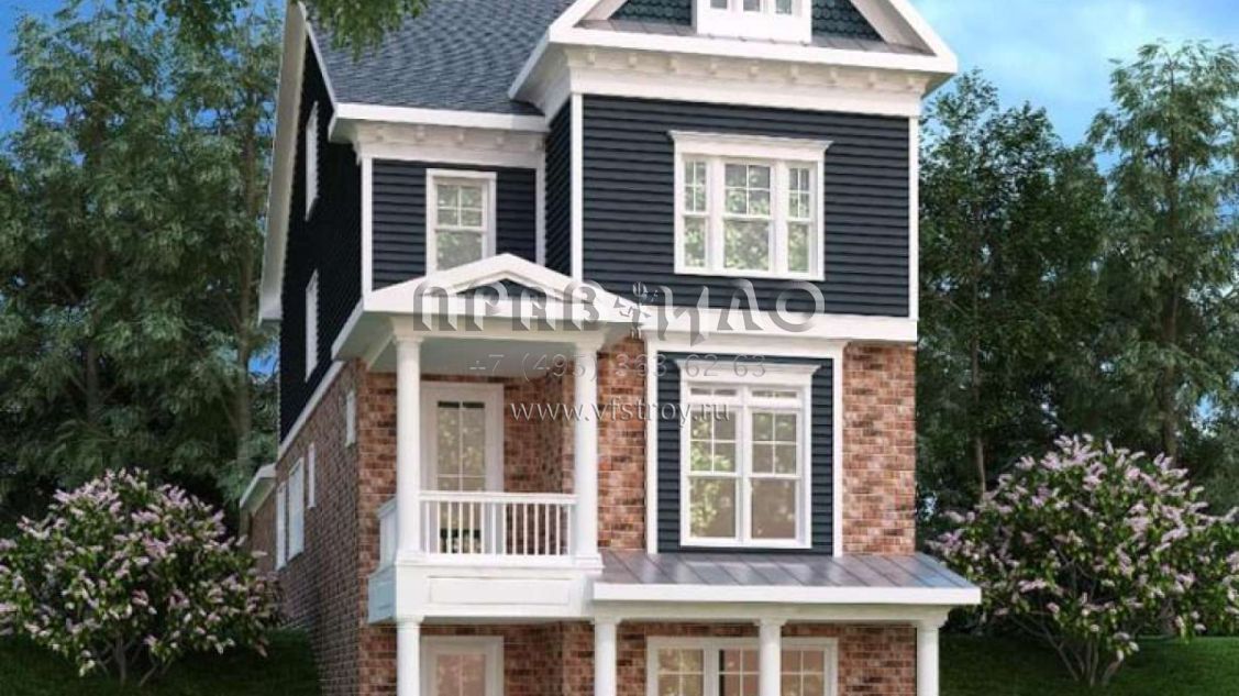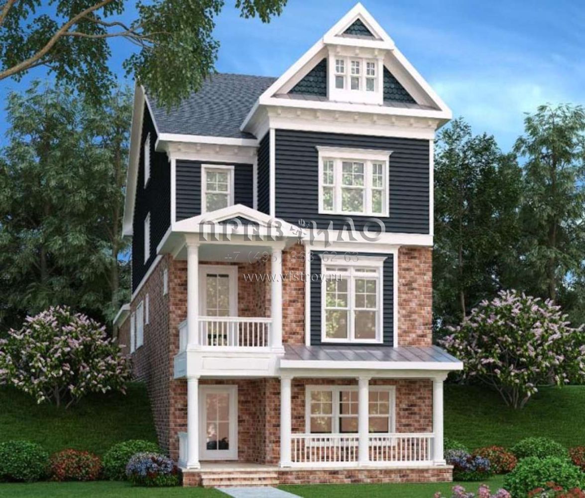 Это проект трехэтажного дома с гаражом на две машины жилой площадью 289 кв.м. Длина дома 26.5 м, ширина 7.3 м, высота 11 м. В доме четыре спальни и четыре санузла.