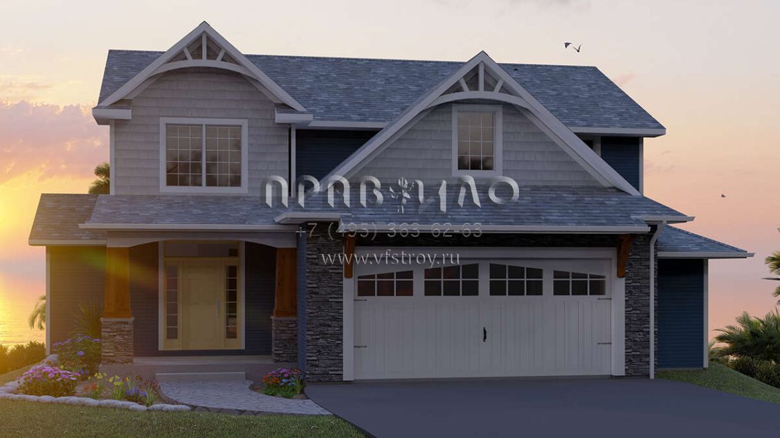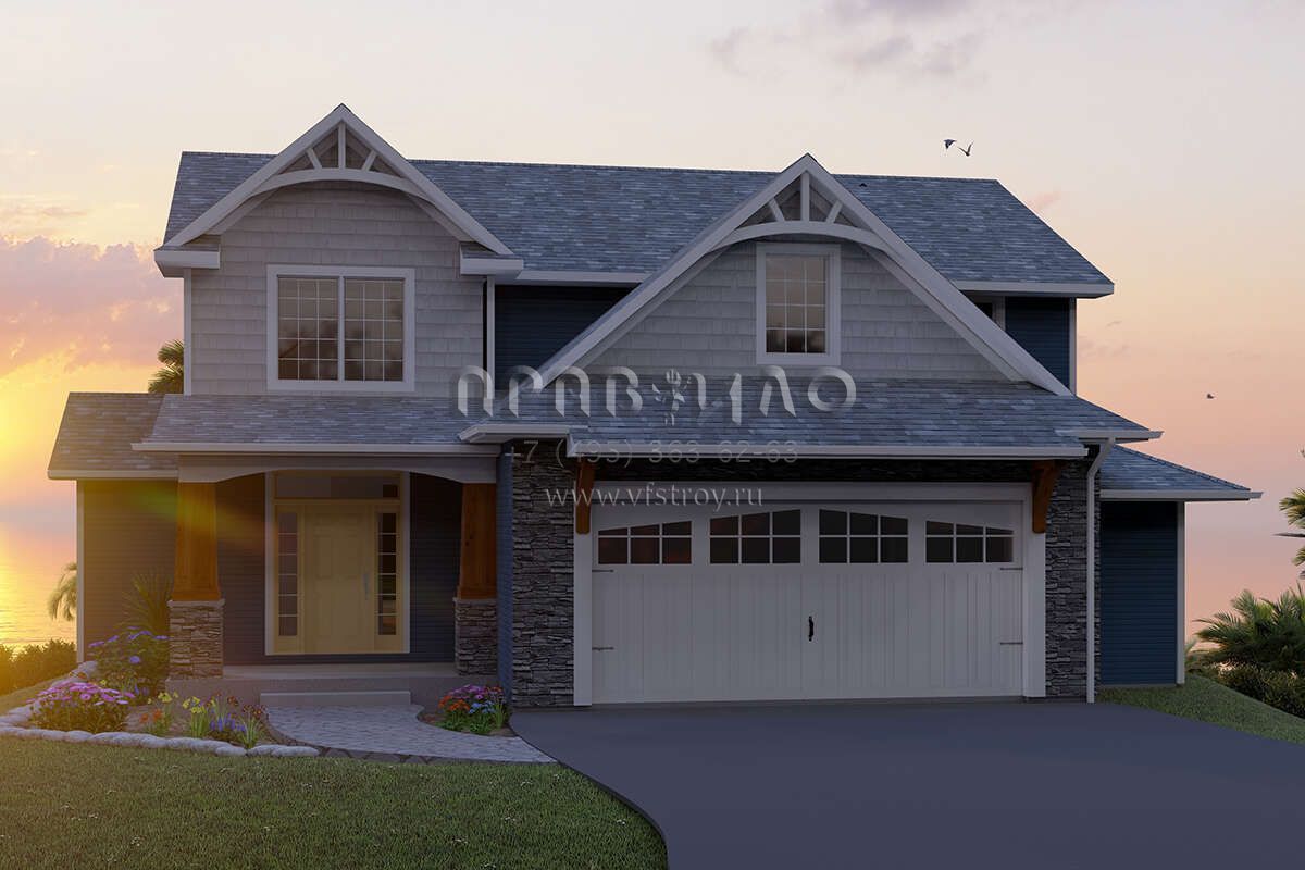 Это проект двухэтажного дома с гаражом на две машины жилой площадью 289 кв.м. Длина дома 22.9 м, ширина 15.5 м, высота 7.6 м. В доме пять спален и три санузла.