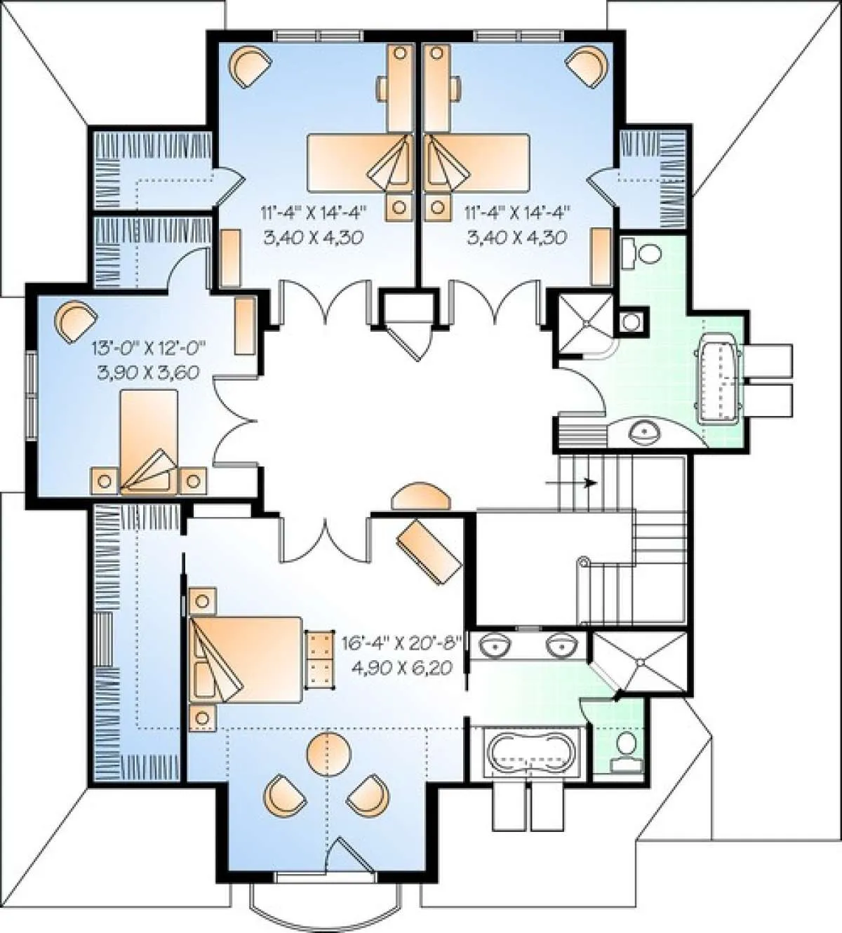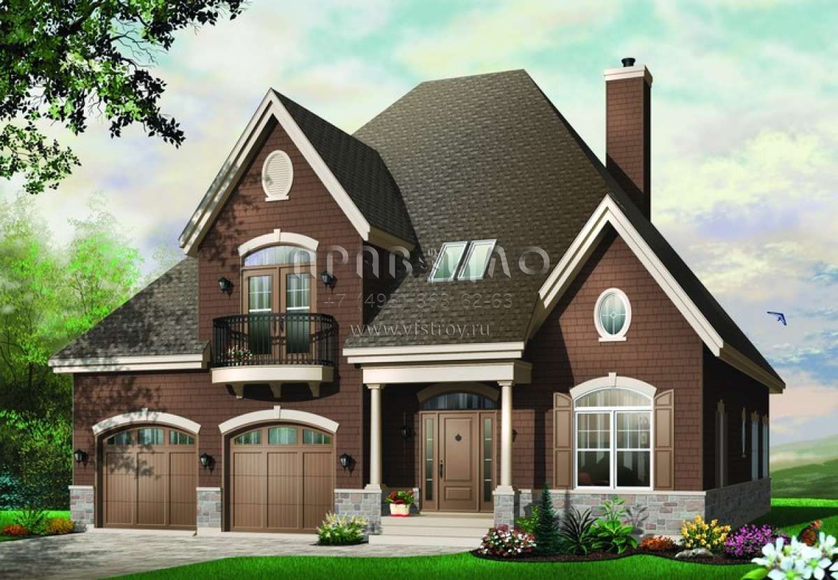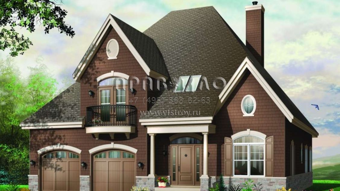 Это проект двухэтажного дома с гаражом на две машины жилой площадью 290 кв.м. Длина дома 15.2 м, ширина 14 м, высота 11.6 м. В доме четыре спальни и два санузла.