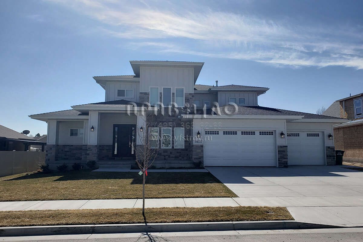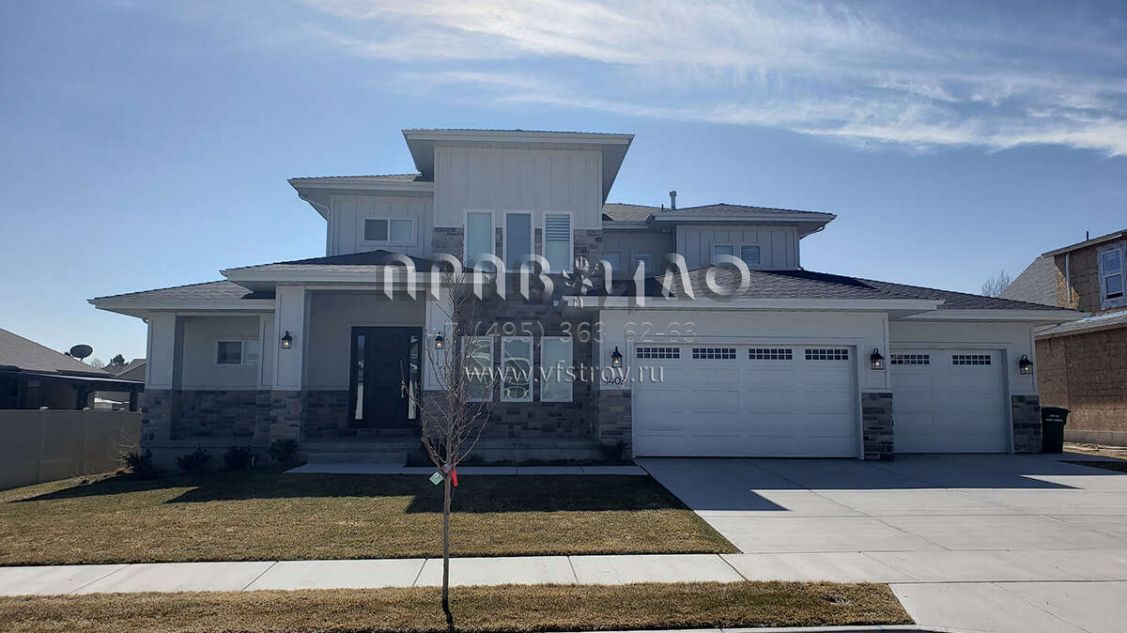 Это проект двухэтажного дома с гаражом на три и более машин жилой площадью 290 кв.м. Длина дома 19.5 м, ширина 20.1 м, высота 7.9 м. В доме пять спален и три санузла.