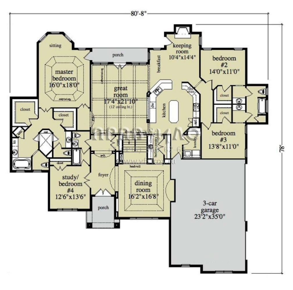 Это проект одноэтажного дома с гаражом на три и более машин жилой площадью 290 кв.м. Длина дома 23.8 м, ширина 24.4 м, высота 8.8 м. В доме четыре спальни и три санузла.