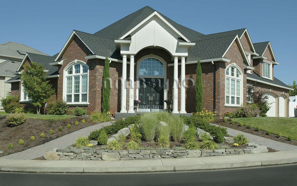 Это проект двухэтажного дома с гаражом на три и более машин жилой площадью 291 кв.м. Длина дома 18.3 м, ширина 24.1 м, высота 10.1 м. В доме четыре спальни и два санузла.