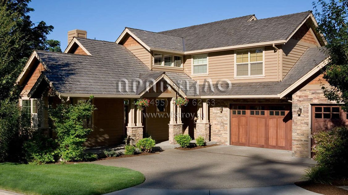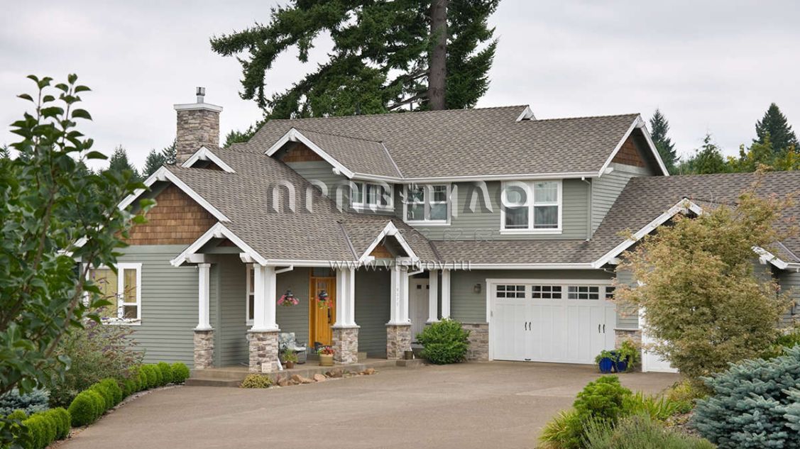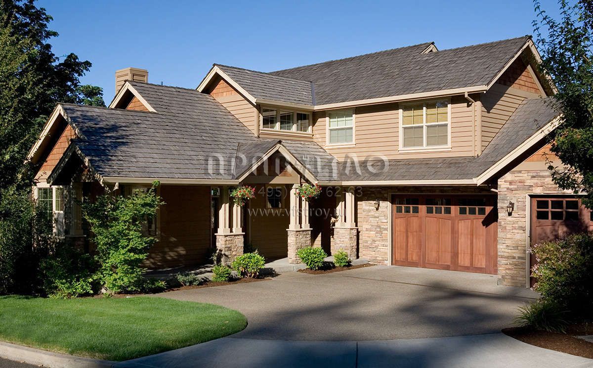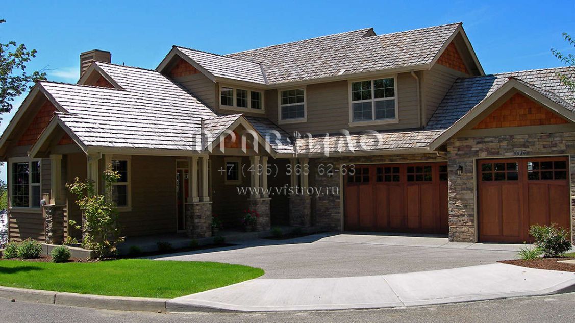 Это проект двухэтажного дома с гаражом на три и более машин жилой площадью 292 кв.м. Длина дома 22.3 м, ширина 16.5 м, высота 8.5 м. В доме четыре спальни и три санузла.