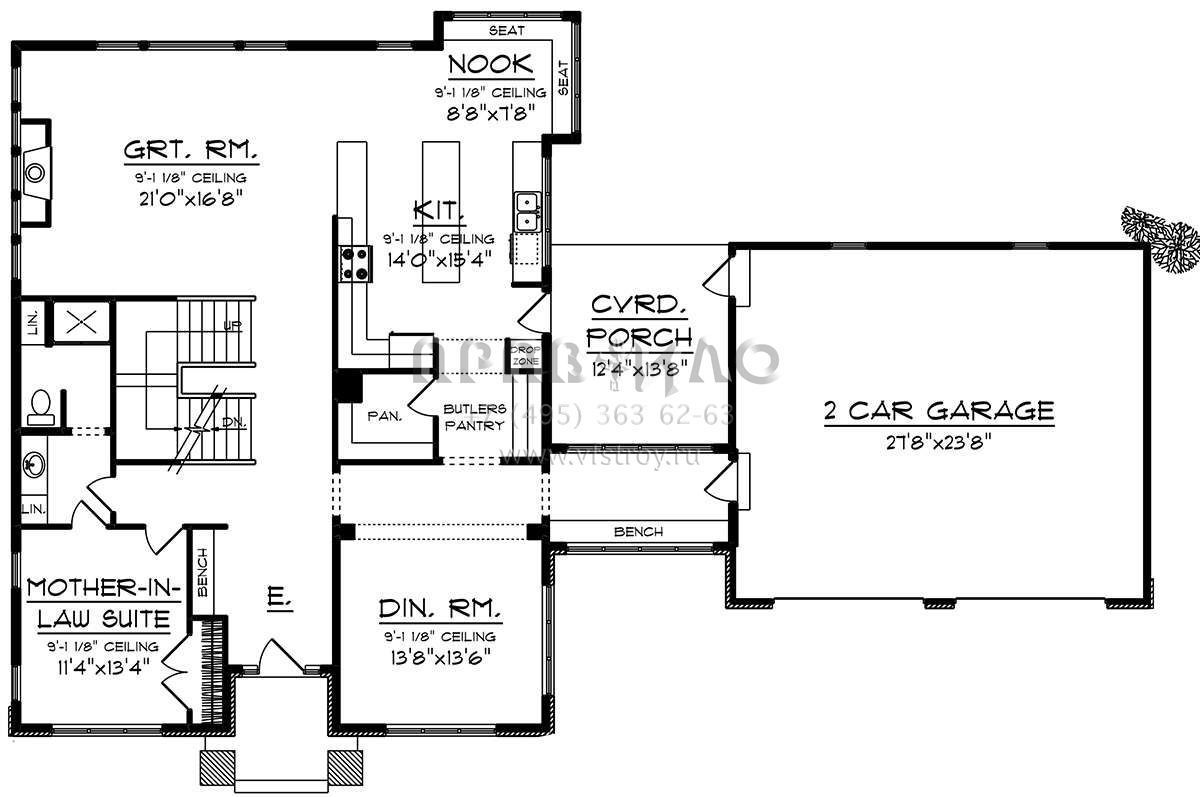 S5-296 (1020-00041) Это иностранный проект, для которого требуется адаптация под нормы, действующие в Российской Федерации. Вы видите проект дома в стиле Райт. В этом доме сочетаются черты сельской постройки и аскетичность лофта. Внутри жильцы смогут проводить время с максимальным комфортом. Обратим внимание, что сейчас на планировках все размеры представлены в футах. Для перевода в метры вам необходимо значение в футах умножить на 0,3048.