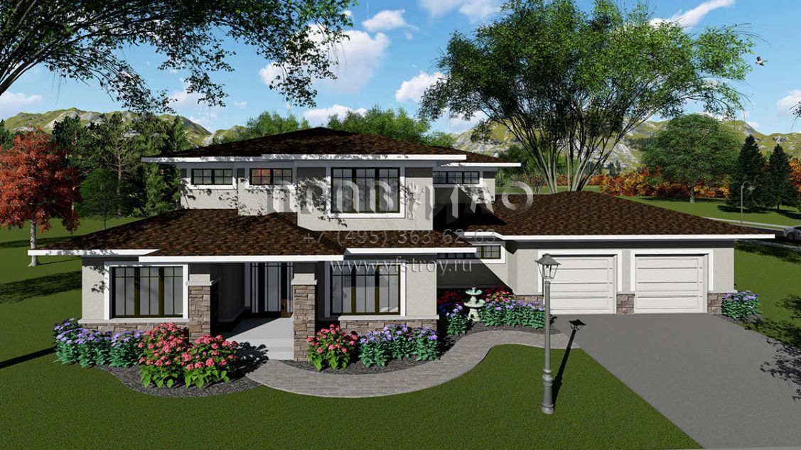 Это проект двухэтажного дома с гаражом на две машины жилой площадью 296 кв.м. Длина дома 15.8 м, ширина 23.5 м, высота 7.3 м. В доме четыре спальни и три санузла.