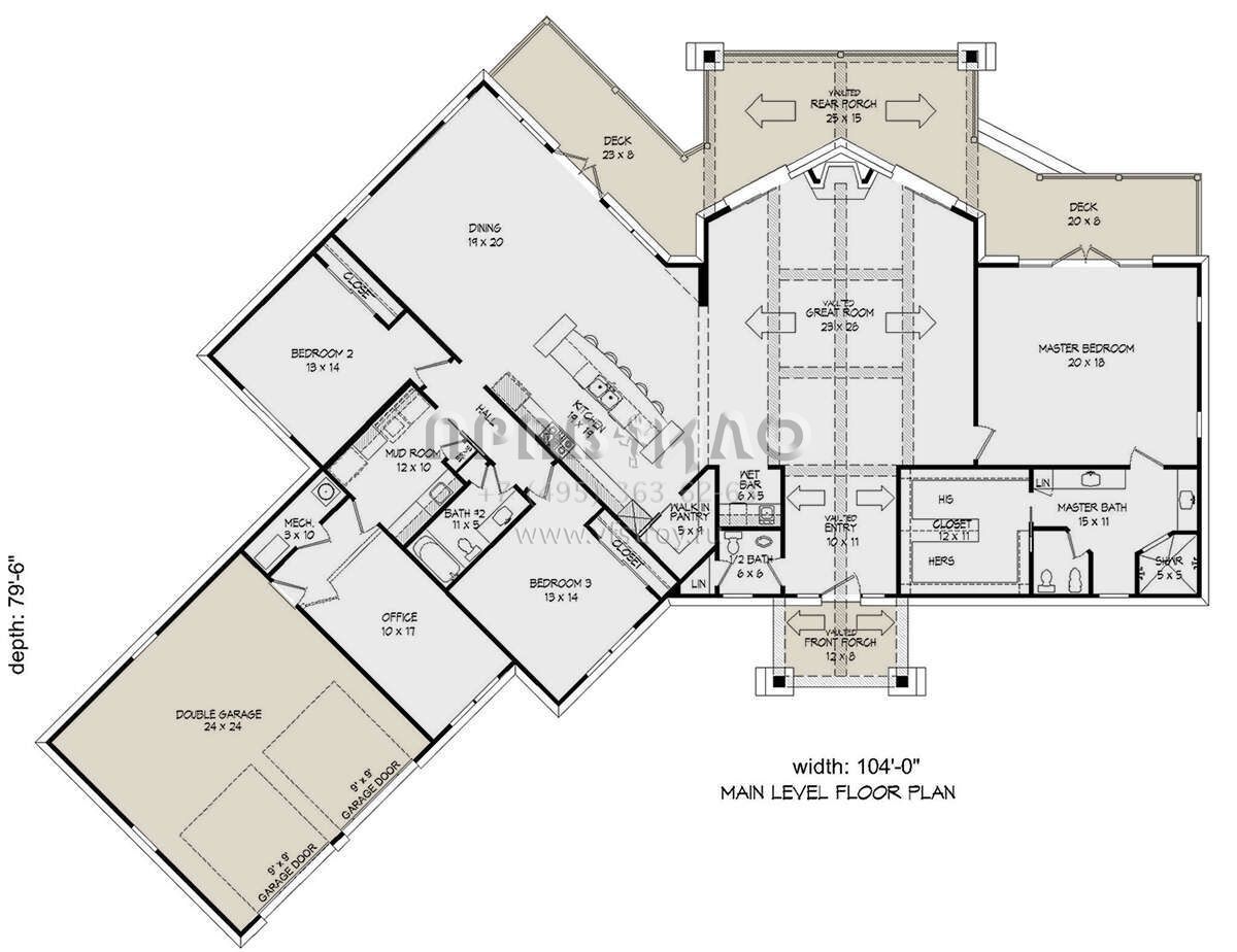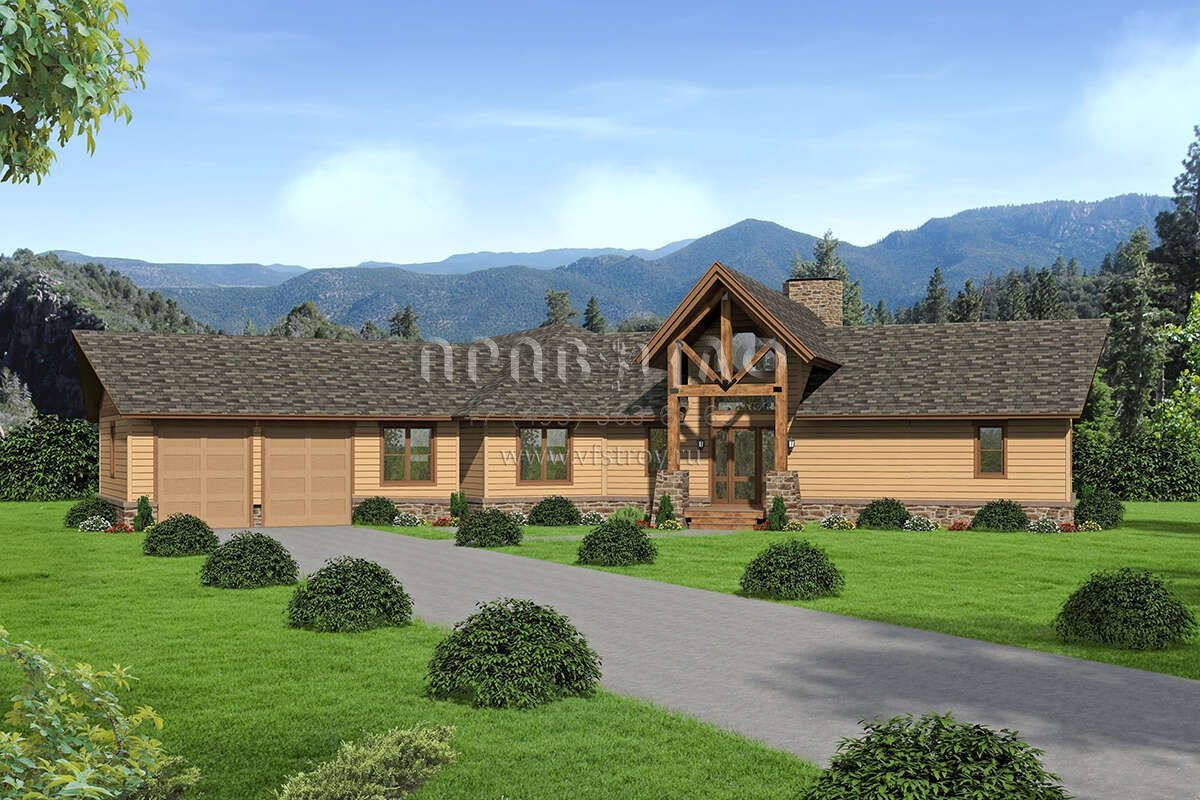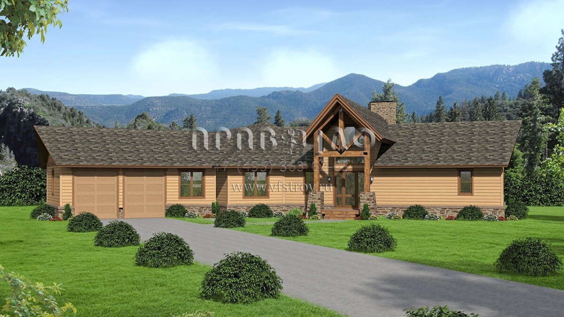 Это проект одноэтажного дома с гаражом на две машины жилой площадью 297 кв.м. Длина дома 24.1 м, ширина 31.7 м, высота 8.8 м. В доме три спальни и два санузла.