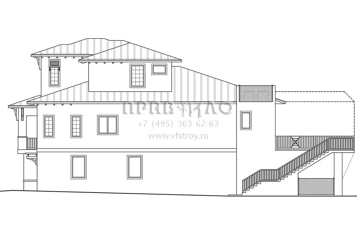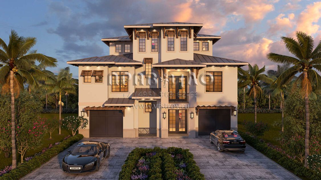 Это проект трехэтажного дома с гаражом на три и более машин жилой площадью 300 кв.м. Длина дома 25 м, ширина 14.9 м, высота 11.6 м. В доме три спальни и три санузла.