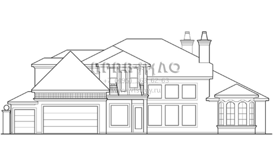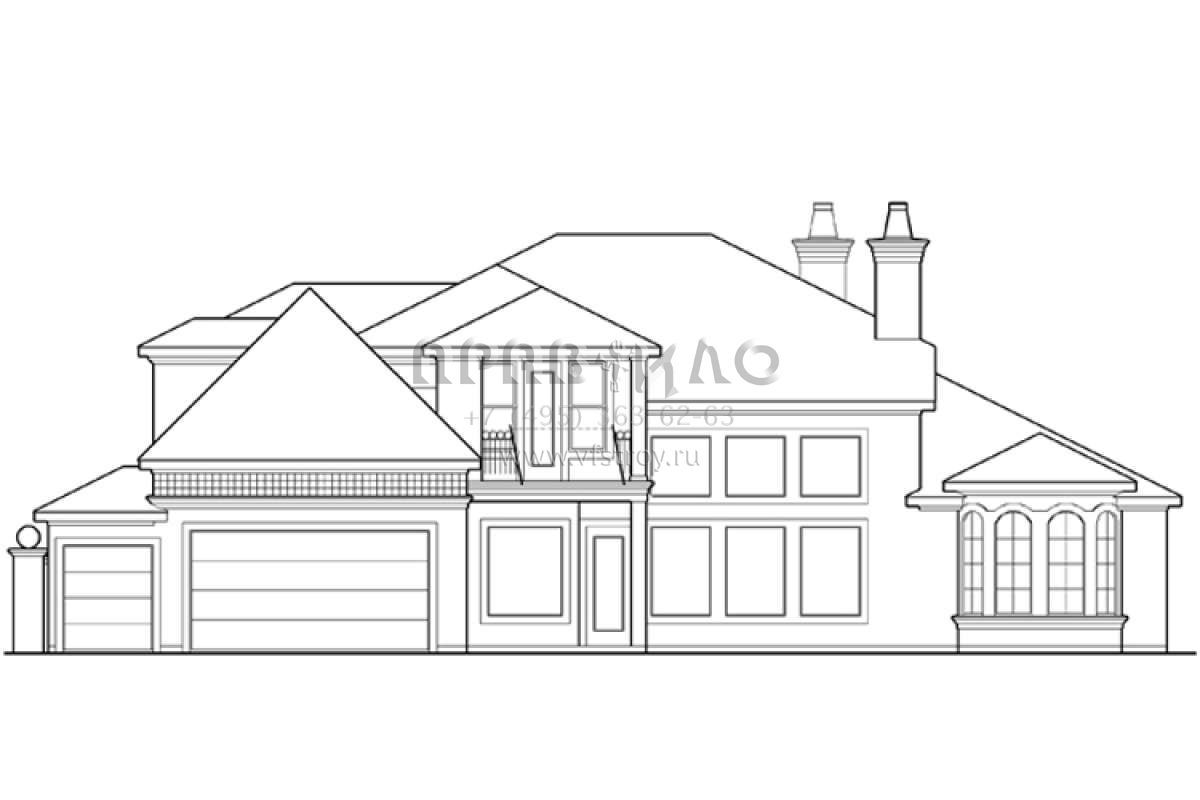 Это проект двухэтажного дома с гаражом на две машины жилой площадью 301 кв.м. Длина дома 19.5 м, ширина 22.9 м, высота 8.5 м. В доме четыре спальни и четыре санузла.