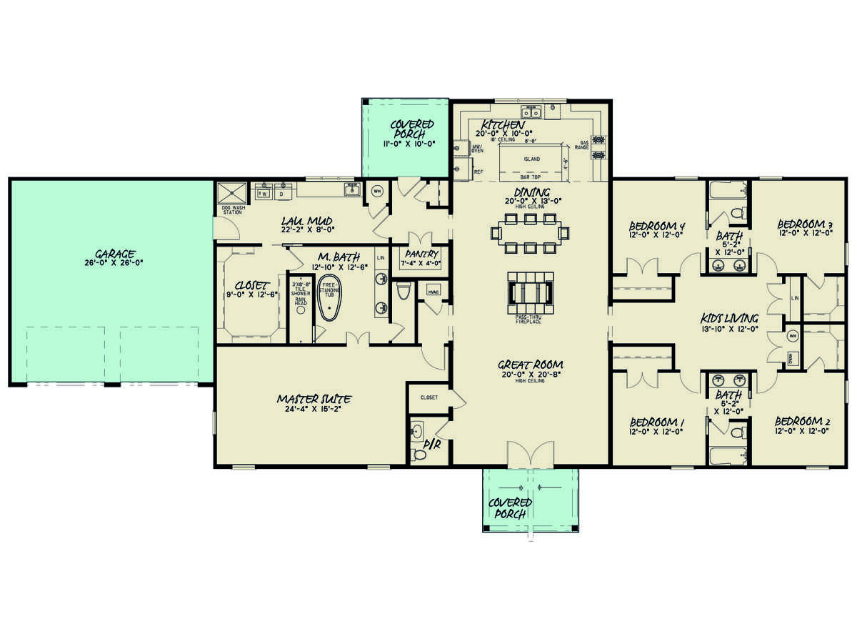 Это проект одноэтажного дома с гаражом на две машины жилой площадью 302 кв.м. Длина дома 16.8 м, ширина 32.6 м, высота 7.9 м. В доме пять спален и три санузла.