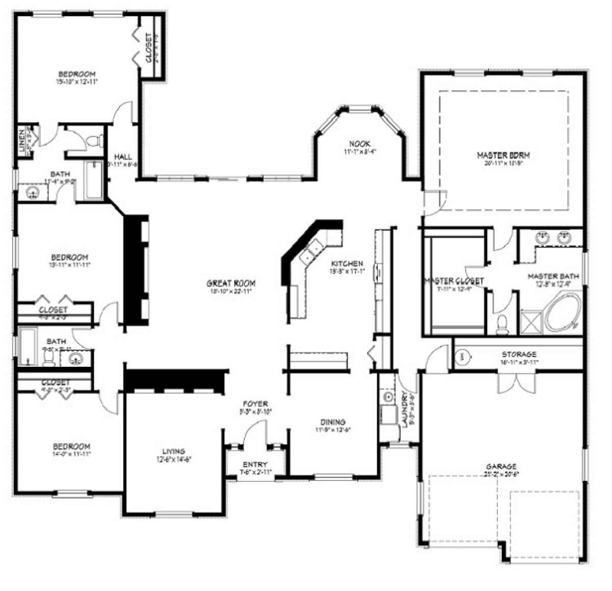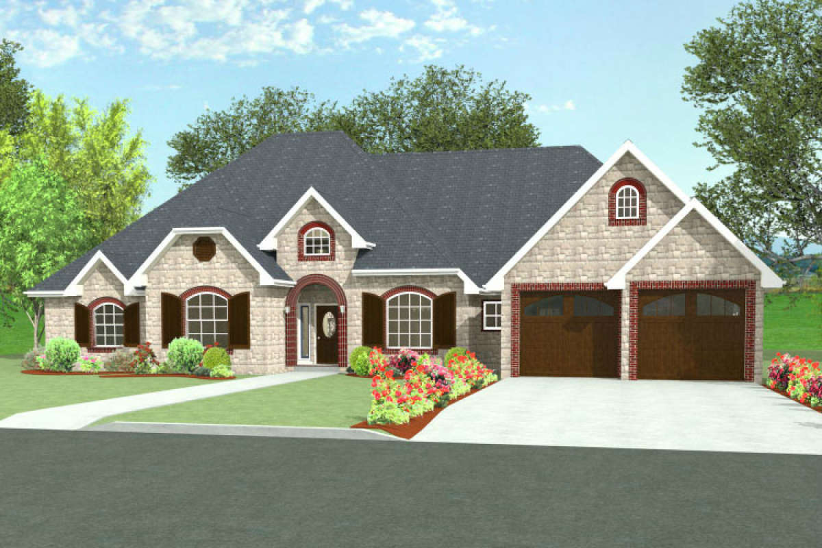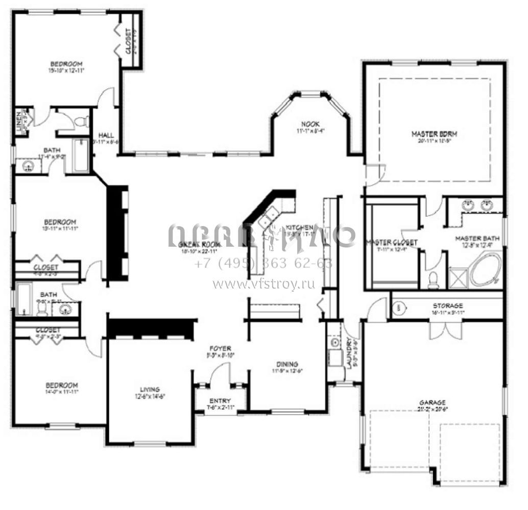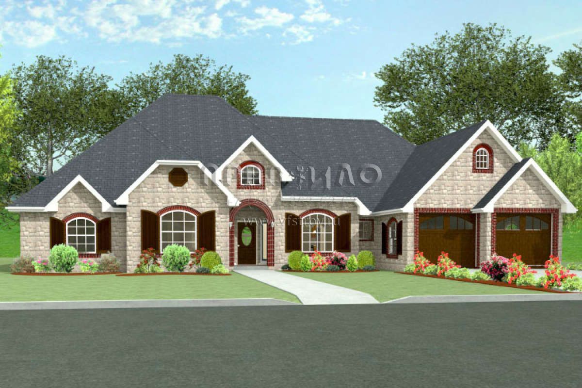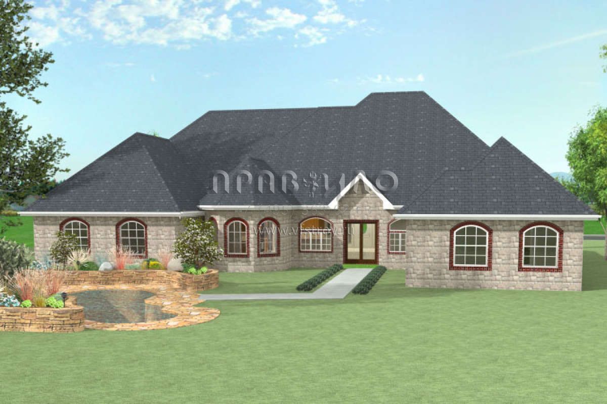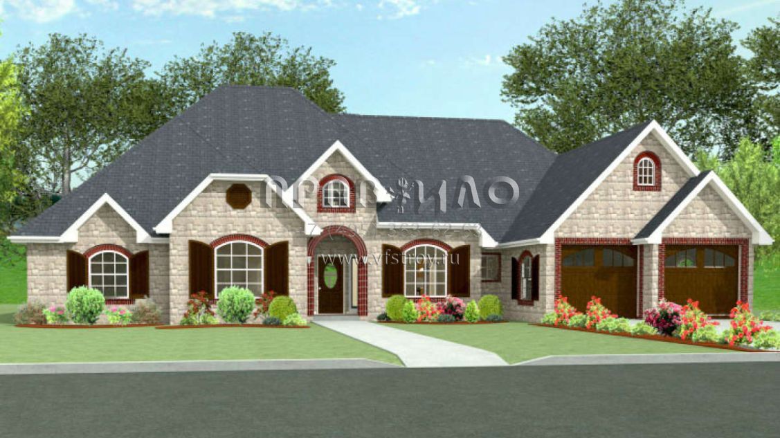 Это проект одноэтажного дома с гаражом на две машины жилой площадью 306 кв.м. Длина дома 20.1 м, ширина 22.9 м, высота 9.1 м. В доме четыре спальни и три санузла.