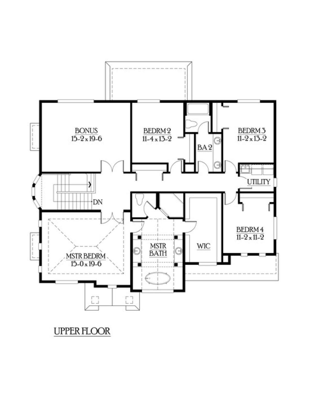 Двухэтажный проект дома позволяет рационально распорядиться площадью участка небольшого размера или узкой формы. На первом этаже находятся общие комнаты (гостиная/столовая, кухня, подсобные и технические помещения), на втором — спальни членов семьи.
