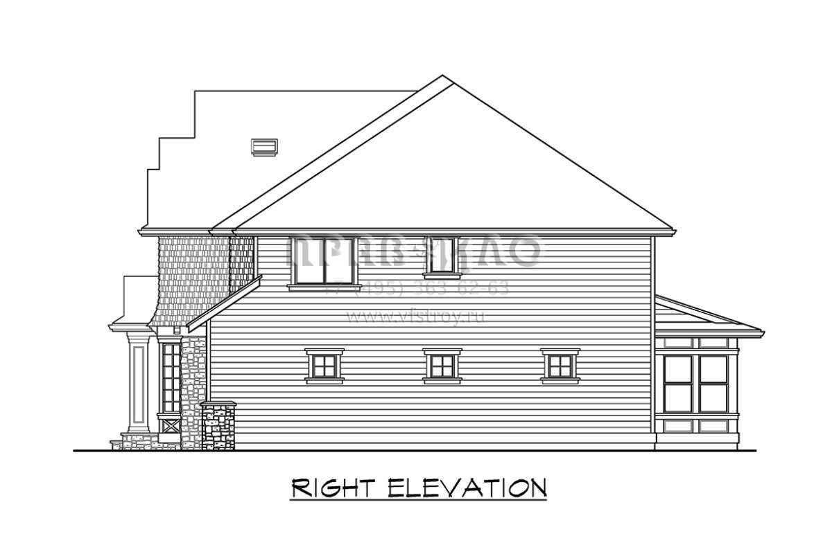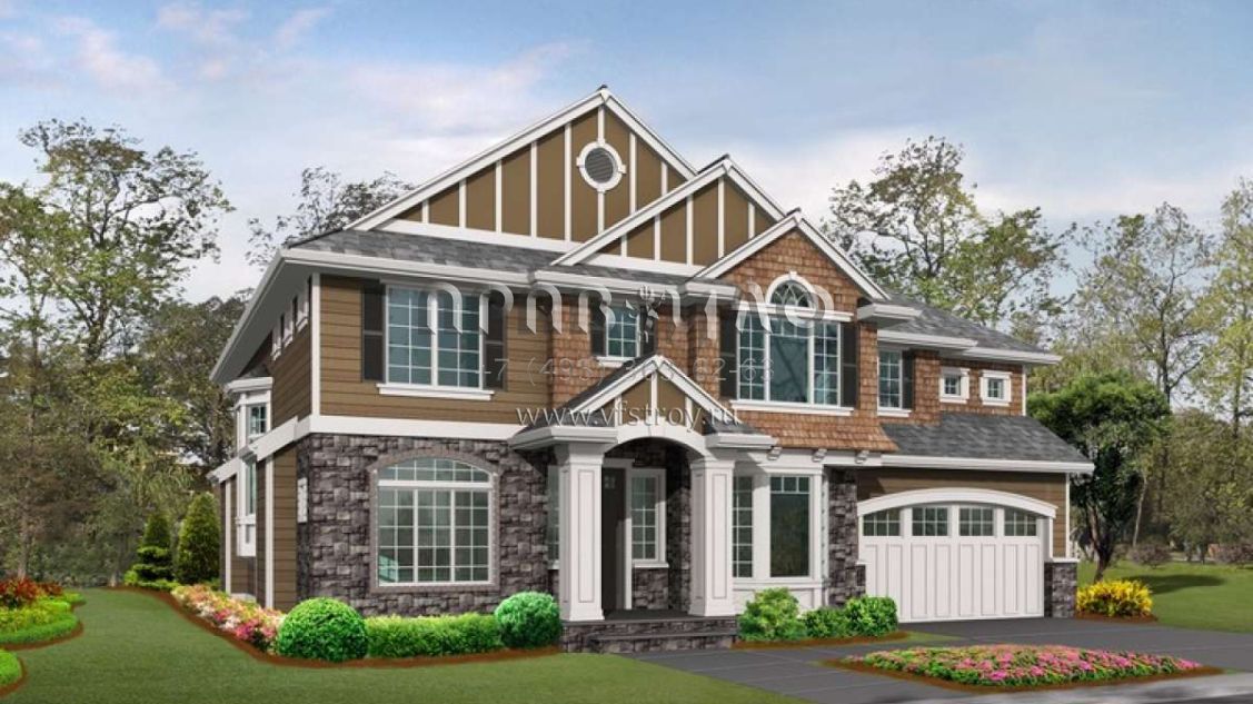 Это проект двухэтажного дома с гаражом на три и более машин жилой площадью 307 кв.м. Длина дома 15.8 м, ширина 15.8 м, высота 9.1 м. В доме четыре спальни и два санузла.
